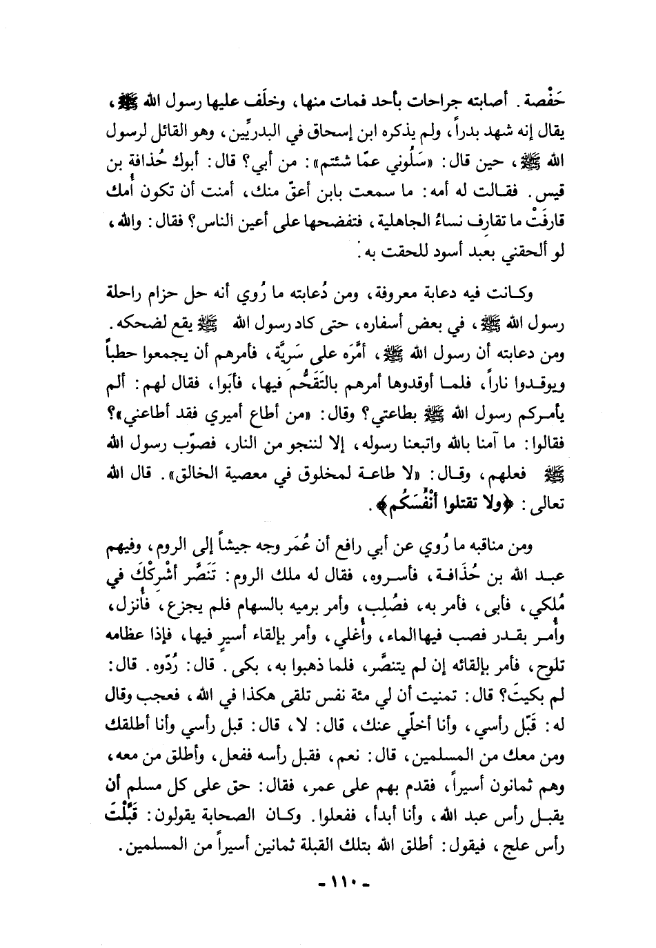 حَفْصة. أصابته جراحات بأحد فمات منها، وخلَف عليها رسول الله -صلى الله عليه وسلم-، يقال إنه شهد بدرًا، ولم يذكره ابن إسحاق في البدريِّين، وهو القائل لرسول الله -صلى الله عليه وسلم-، حين قال: "سَلُوني عمّا شئتم": من أبي؟ قال: أبوك حُذافة بن قيس. فقالت له أمه: ما سمعت بابن أعقّ منك، أمنت أن تكون أُمك قارفَتْ ما تقارِف نساءُ الجاهلية، فتفضحها على أعين الناس؟ فقال: والله، لو ألحقني بعبد أسود للحقت به.