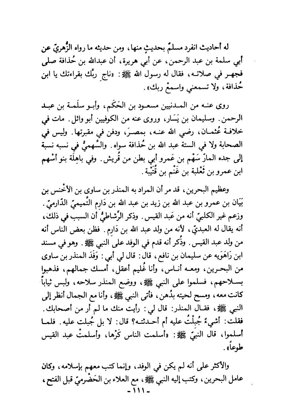 وعظيم البحرين، قد مر أن المراد به المنذر بن ساوى بن الأخْنس بن بَيَان بن عمرو بن عبد الله بن زيد بن عبد الله بن دَارِم التَّميميّ الدّارميّ. وزعم غير الكلبيّ أنه من عَبد القيس. وذكر الرِّشاطيُّ أن السبب في ذلك، أنه يقال له العبديّ، لأنه من ولد عبد الله بن دَارِم. فظن بعض الناس أنه من ولد عبد القيس. وذُكر أنه قدم في الوفد على النبي -صلى الله عليه وسلم-. وهو في مسند ابن رَاهَوَيه عن سليمان بن نافع، قال: قال لي أبي: وَفَدَ المنذر بن ساوى من البحرين، ومعه أناس، وأنا غُليم أعقل، أمسك جمالهم، فذهبوا بسلاحهم، فسلموا على النبي -صلى الله عليه وسلم-، ووضع المنذر سلاحه، ولبس ثيابًا كانت معه، ومسح لحيته بدُهن، فأتى النبي -صلى الله عليه وسلم-، وأنا مع الجمال أنظر إلى النبي -صلى الله عليه وسلم-، فقال المنذر: قال لي: رأيت منك ما لم أر من أصحابك. فقلت: أشيءٌ جُبِلْتُ عليه أم أحدثته؟ قال: لا بل جُبلت عليه. فلما أسلموا، قال النبيّ -صلى الله عليه وسلم-: "أسلمت الناس كَرْها، وأسلمتْ عبد القيس طوعًا".