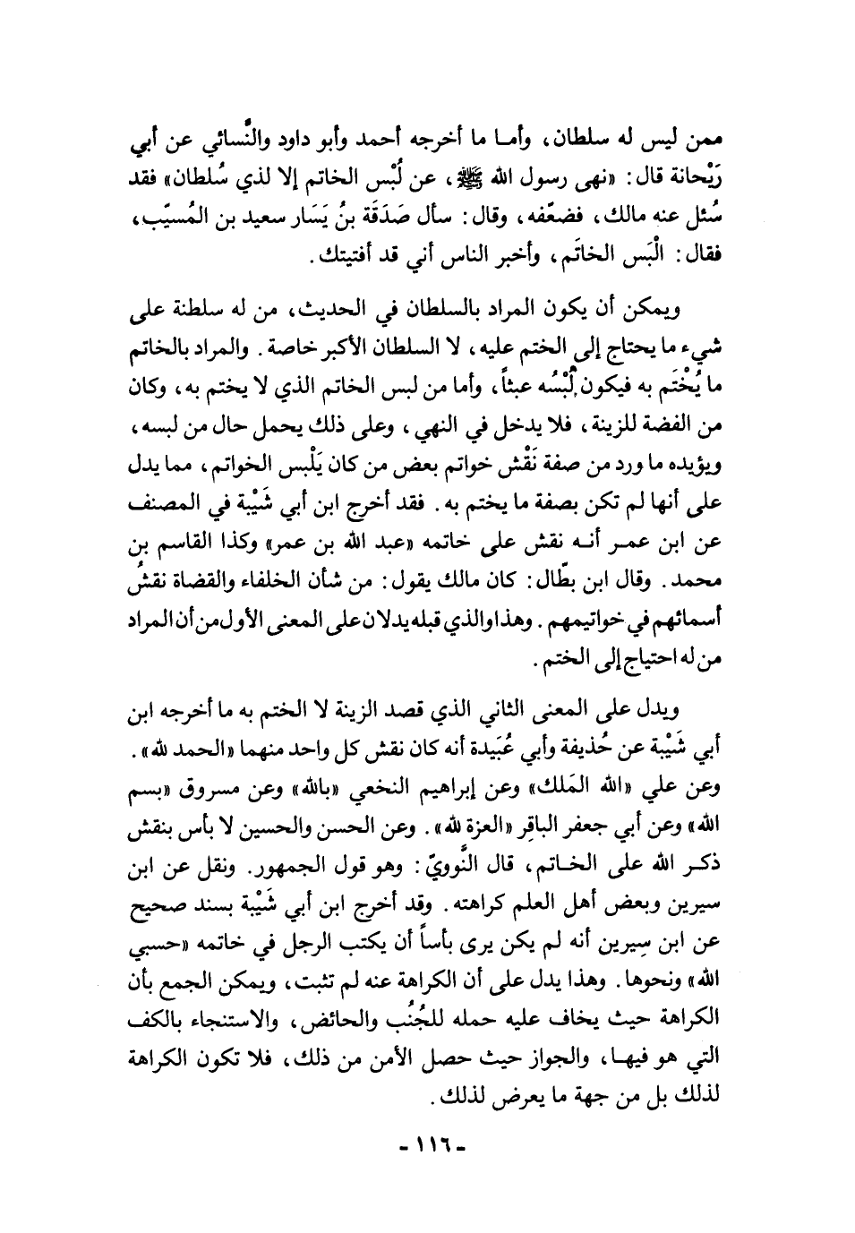 ويمكن أن يكون المراد بالسلطان في الحديث، من له سلطنة على شيء ما يحتاج إلى الختم عليه، لا السلطان الأكبر خاصة. والمراد بالخاتم ما يُخْتَم به فيكون لُبْسُه عبثًا، وأما من لبس الخاتم الذي لا يختم به، وكان من الفضة للزينة، فلا يدخل في النهي، وعلى ذلك يحمل حال من لبسه، ويؤيده ما ورد من صفة نَقْش خواتم بعض من كان يَلْبس الخواتم، مما يدل على أنها لم تكن بصفة ما يختم به. فقد أخرج ابن أبي شَيْبة في المصنف عن ابن عمر أنه نقش على خاتمه "عبد الله بن عمر" وكذا القاسم بن محمد. وقال ابن بطّال: كان مالك يقول: من شأن الخلفاء والقضاة نقشُ أسمائهم في خواتيمهم. وهذا والذي قبله يدلان على المعنى الأول من أن المراد من له احتياج إلى الختم.