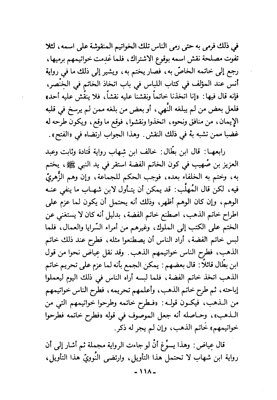 رابعها: قال ابن بطّال: خالف ابن شِهاب رواية قَتادة وثابت وعبد العزيز بن صُهيب في كون الخاتم الفضة استقر في يد النبي -صلى الله عليه وسلم-، يختم به، وختم به الخلفاء بعده، فوجب الحكم للجماعة، وإن وهم الزُّهريّ فيه، لكن قال المُهلَّب: قد يمكن أن يتأول لابن شهاب ما ينفي عنه الوهم، وإن كان الوهم أظهر، وذلك أنه يحتمل أن يكون لما عزم على اطراح خاتم الذهب، اصطنع خاتم الفضة، بدليل أنه كان لا يستغني عن الختم على الكتب إلى الملوك، وغيرهم من أمراء السّرايا والعمال، فلما لبس خاتم الفضة، أراد الناس أن يصطنعوا مثله، فطرح عند ذلك خاتم الذهب، فطرح الناس خواتيمهم الذهب. وقد نقل عِياض نحوا من قول ابن بطّال قائلًا: قال بعضهم: يمكن الجمع بأنه لما عزم على تحريم خاتم الذهب اتخذ خاتم الفضة، فلما لبسه أراه الناس في ذلك اليوم ليعملوا إباحته، ثم طرح خاتم الذهب، وأعلمهم تحريمه، فطرح الناس خواتيمهم من الذهب، فيكون قوله: "فطرح خاتمه وطرحوا خواتيمهم التي من الذهب"، وحاصله أنه جعل الموصوف في قوله "فطرح خاتمه فطرحوا خواتيمهم" خَاتم الذهب، وإن لم يجر له ذكر.