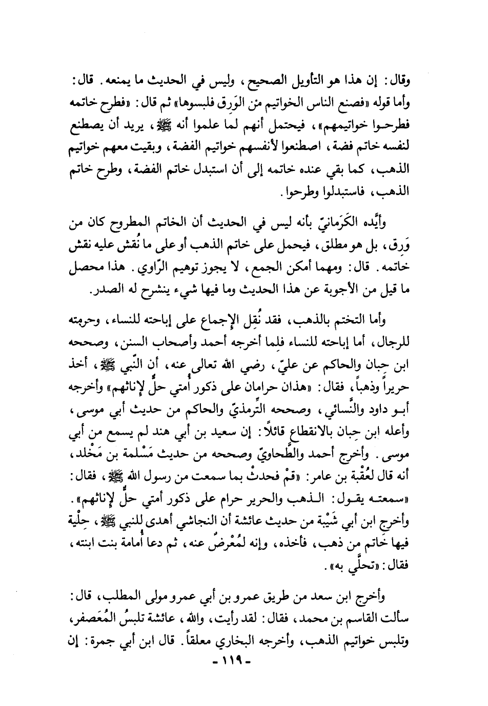 وأخرج ابن سعد من طريق عمرو بن أبي عمرو مولى المطلب، قال: سألت القاسم بن محمد، فقال: لقد رأيت، والله، عائشة تلبسُ المُعَصفر، وتلبس خواتيم الذهب، وأخرجه البخاري معلقًا. قال ابن أبي جمرة: إن