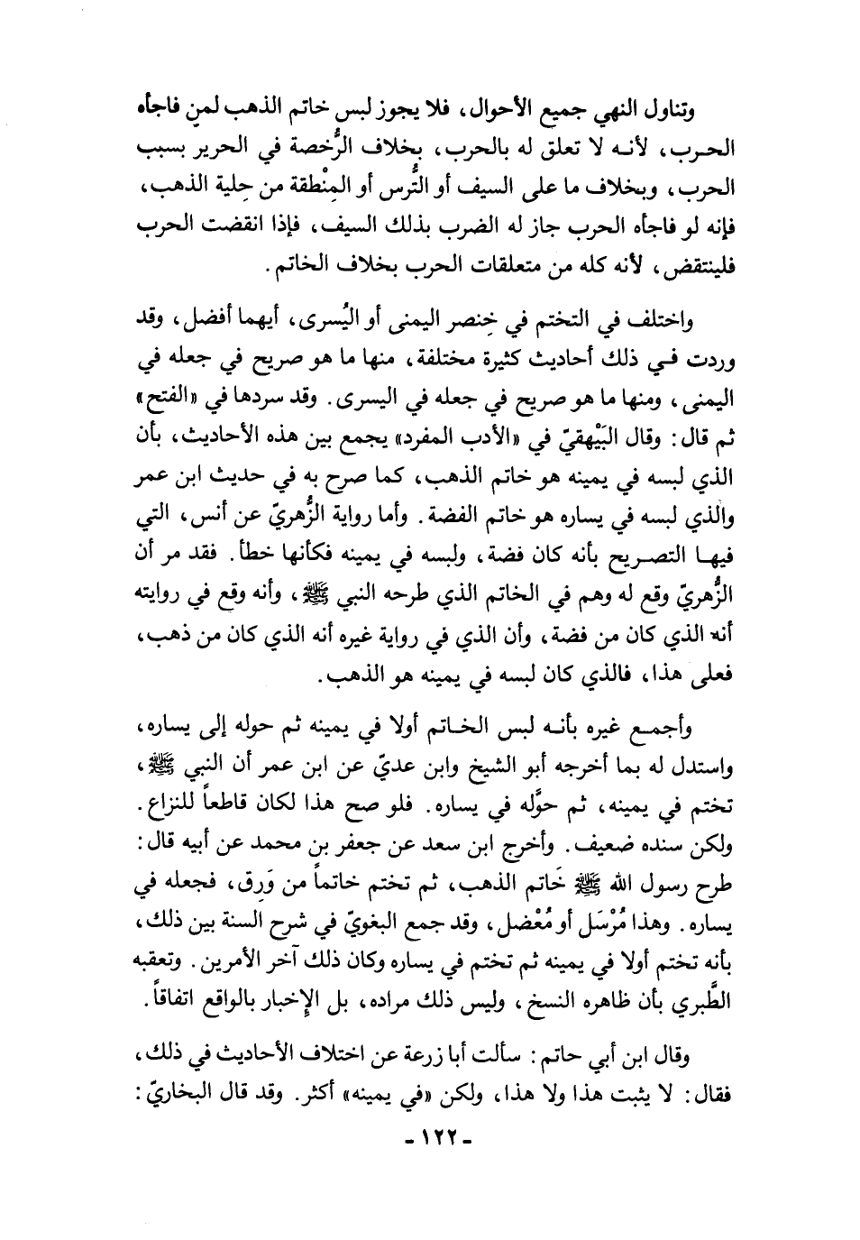 وأجمع غيره بأنه لبس الخاتم أولا في يمينه ثم حوله إلى يساره، واستدل له بما أخرجه أبو الشيخ وابن عديّ عن ابن عمر أن النبي -صلى الله عليه وسلم-، تختم في يمينه، ثم حوَّله في يساره. فلو صح هذا لكان قاطعًا للنزاع. ولكن سنده ضعيف. وأخرج ابن سعد عن جعفر بن محمد عن أبيه قال: طرح رسول الله -صلى الله عليه وسلم- خَاتم الذهب، ثم تختم خاتمًا من وَرِق، فجعله في يساره. وهذا مُرْسَل أو مُعْضل، وقد جمع البغويّ في شرح السنة بين ذلك، بأنه تختم أولا في يمينه ثم تختم في يساره وكان ذلك آخر الأمرين. وتعقبه الطَّبري بأن ظاهره النسخ، وليس ذلك مراده، بل الإِخبار بالواقع اتفاقًا.