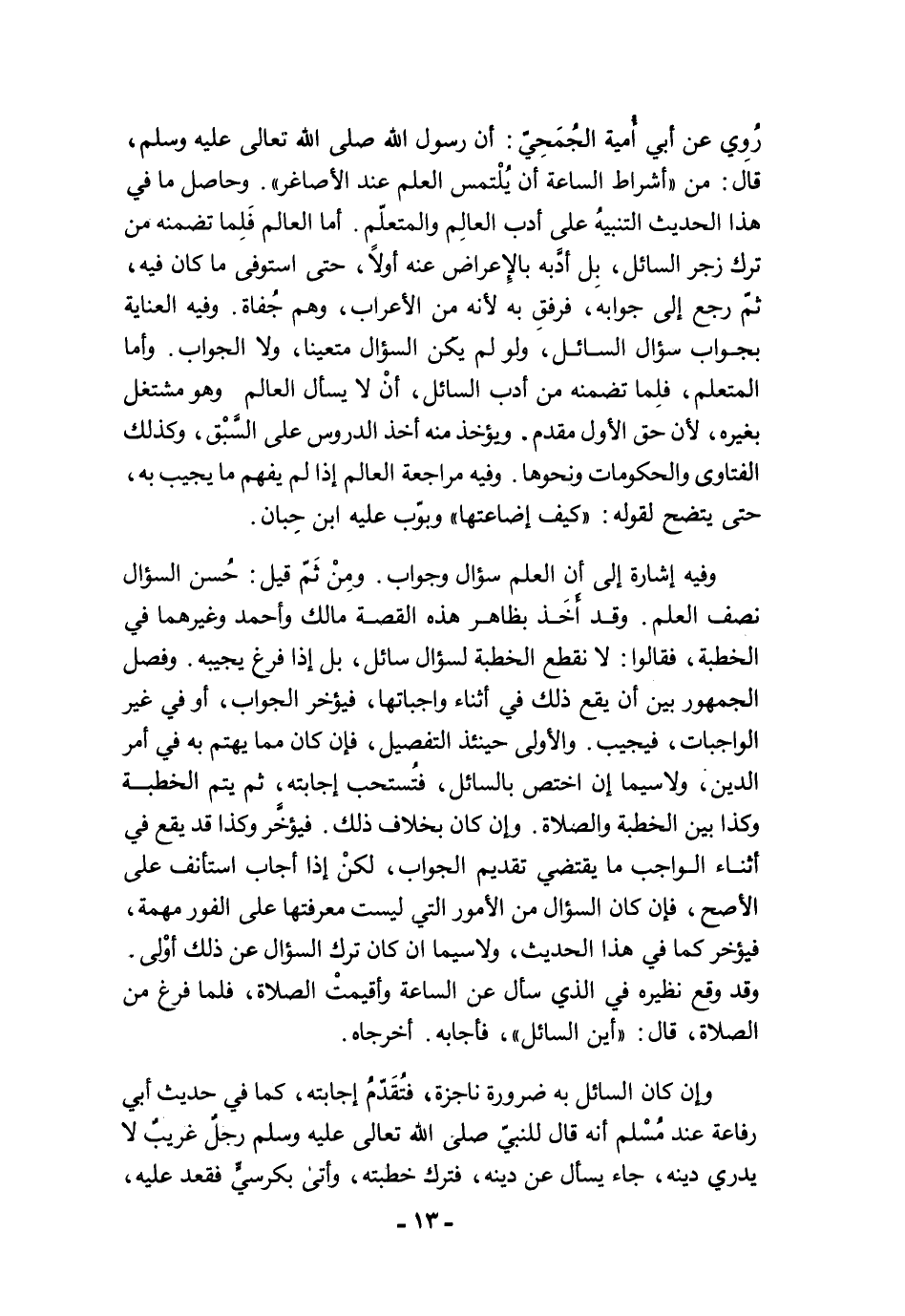 رُوِي عن أبي أُمية الجُمَحِيّ: أن رسول الله صلى الله تعالى عليه وسلم، قال: من "أشراط الساعة أن يُلْتمس العلم عند الأصاغر". وحاصل ما في هذا الحديث التنبيهُ على أدب العالِم والمتعلّم. أما العالم فَلِما تضمنه من ترك زجر السائل، بِل أدَّبه بالِإعراض عنه أولًا، حتى استوفى ما كان فيه، ثمّ رجع إلى جوابه، فرفق به لأنه من الأعراب، وهم جُفاة. وفيه العناية بجواب سؤال السائل، ولو لم يكن السؤال متعينا، ولا الجواب. وأما المتعلم، فلِما تضمنه من أدب السائل، أنْ لا يسأل العالم وهو مشتغل بغيره، لأن حق الأول مقدم. ويؤخذ منه أخذ الدروس على السَّبْق، وكذلك الفتاوى والحكومات ونحوها. وفيه مراجعة العالم إذا لم يفهم ما يجيب به، حتى يتضح لقوله: "كيف إضاعتها" وبوّب عليه ابن حِبان.