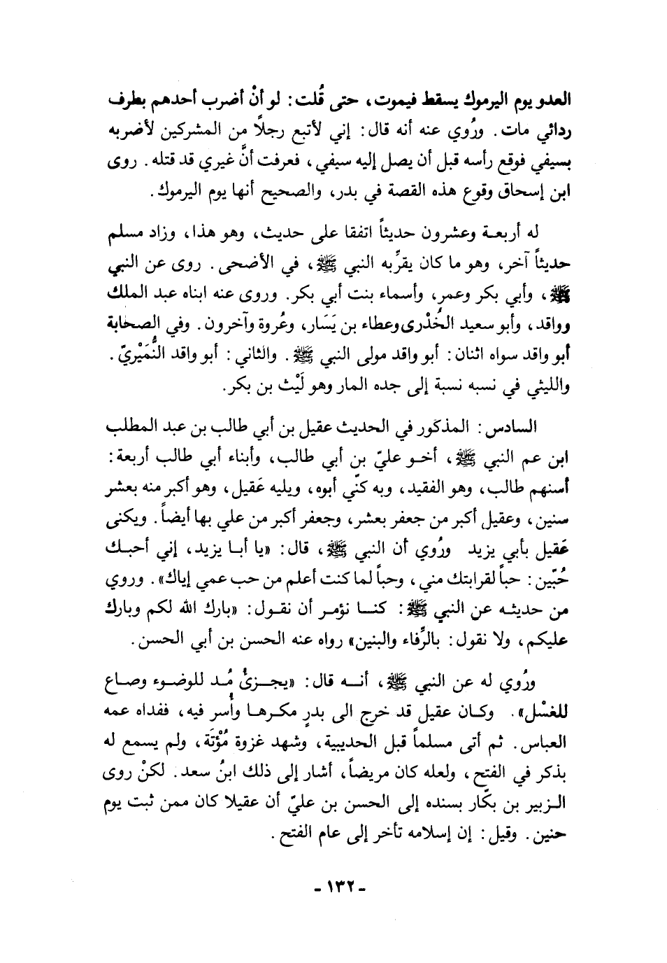 السادس: المذكور في الحديث عقيل بن أبي طالب بن عبد المطلب ابن عم النبي -صلى الله عليه وسلم-، أخو عليّ بن أبي طالب، وأبناء أبي طالب أربعة: أسنهم طالب، وهو الفقيد، وبه كنّي أبوه، ويليه عَقيل، وهو أكبر منه بعشر سنين، وعقيل أكبر من جعفر بعشر، وجعفر أكبر من علي بها أيضًا. ويكنى عَقيل بأبي يزيد ورُوي أن النبي -صلى الله عليه وسلم-، قال: "يا أبا يزيد، إني أحبك حُبّين: حبًا لقرابتك مني، وحبًا لما كنت أعلم من حب عمي إياك". وروي من حديثه عن النبي -صلى الله عليه وسلم-: كنا نؤمر أن نقول: "بارك الله لكم وبارك عليكم، ولا نقول: بالرِّفاء والبنين" رواه عنه الحسن بن أبي الحسن.