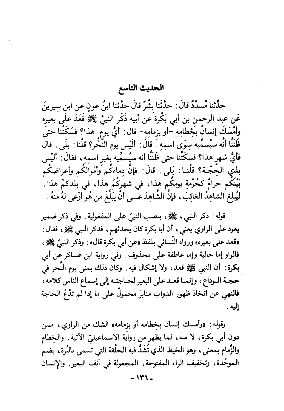 حَدَّثَنَا مُسَدَّدٌ قَالَ حَدَّثَنَا بِشْرٌ قَالَ حَدَّثَنَا ابْنُ عَوْنٍ عَنِ ابْنِ سِيرِينَ عَنْ عَبْدِ الرَّحْمَنِ بْنِ أَبِي بَكْرَةَ عَنْ أَبِيهِ ذَكَرَ النَّبِيَّ -صلى الله عليه وسلم- قَعَدَ عَلَى بَعِيرِهِ، وَأَمْسَكَ إِنْسَانٌ بِخِطَامِهِ -أَوْ بِزِمَامِهِ- قَالَ: "أَىُّ يَوْمٍ هَذَا؟ ". فَسَكَتْنَا حَتَّى ظَنَنَّا أَنَّهُ سَيُسَمِّيهِ سِوَى اسْمِهِ. قَالَ:"أَلَيْسَ يَوْمَ النَّحْرِ". قُلْنَا بَلَى. قَالَ: "فَأَىُّ شَهْرٍ هَذَا؟ ". فَسَكَتْنَا حَتَّى ظَنَنَّا أَنَّهُ سَيُسَمِّيهِ بِغَيْرِ اسْمِهِ. فَقَالَ: "أَلَيْسَ بِذِى الْحِجَّةِ؟ ". قُلْنَا بَلَى. قَالَ: "فَإِنَّ دِمَاءَكُمْ وَأَمْوَالَكُمْ وَأَعْرَاضَكُمْ بَيْنَكُمْ حَرَامٌ كَحُرْمَةِ يَوْمِكُمْ هَذَا، فِي شَهْرِكُمْ هَذَا، فِي بَلَدِكُمْ هَذَا. لِيُبَلِّغِ الشَّاهِدُ الْغَائِبَ، فَإِنَّ الشَّاهِدَ عَسَى أَنْ يُبَلِّغَ مَنْ هُوَ أَوْعَى لَهُ مِنْهُ".