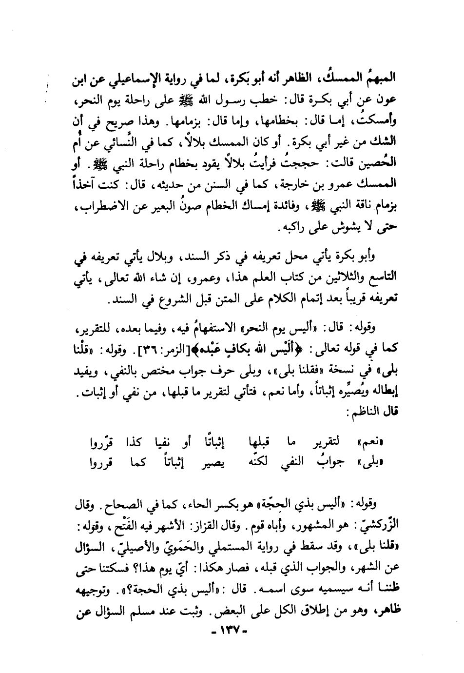 وقوله: قال: "أليس يوم النحر" الاستفهامُ فيه، وفيما بعده، للتقرير، كما في قوله تعالى: {أَلَيْسَ اللَّهُ بِكَافٍ عَبْدَهُ} [الزمر: 36]. وقوله: "قلْنا بلى" في نسخة "فقلنا بلى"، وبلى حرف جواب مختص بالنفي، ويفيد إبطاله ويُصيِّره إثباتًا، وأما نعم، فتأتي لتقرير ما قبلها، من نفي أو إثبات. قال الناظم: