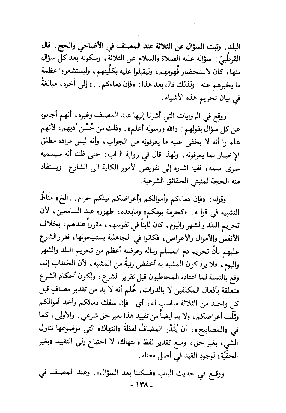 وقوله: "فإن دماءكم وأموالكم وأعراضكم بينكم حرام .. الخ" مَنَاطُ التشبيه في قوله: "كحرمة يومكم" وما بعده، ظهوره عند السامعين، لأن تحريم البلد والشهر واليوم، كان ثابتًا في نفوسهم، مقررًا عندهم، بخلاف الأنفس والأموال والأعراض، فكانوا في الجاهلية يستبيحونها، فقرر الشرع عليهم بأنّ تحريم دم المسلم وماله وعرضه أعظم من تحريم البلد والشهر واليوم، فلا يرد كون المشبه به أخفض رتبةً من المشبه، لأن الخطاب إنما وقع بالنسبة لما اعتاده المخاطبون قبل تقرير الشرع، ولكون أحكام الشرع متعلقة بأفعال المكلفين لا بالذوات، عُلم أنه لابد من تقدير مضافٍ قبل كل واحد من الثلاثة مناسبٍ له، أي: فإن سفك دمائكم وأخذ أموالكم وثَلْب أعراضكم، ولابد أيضًا من تقييد هذا بغير حق شرعي. والأولى، كما في "المصابيح"، أن يُقَدَّر المضافُ لفظةَ "انتهاك" التي موضوعها تناول الشيء بغير حق، ومع تقدير لفظ "انتهاك" لا احتياج إلى التقييد "بغير الحقّيّة" لوجود القيد في أصل معناه.
