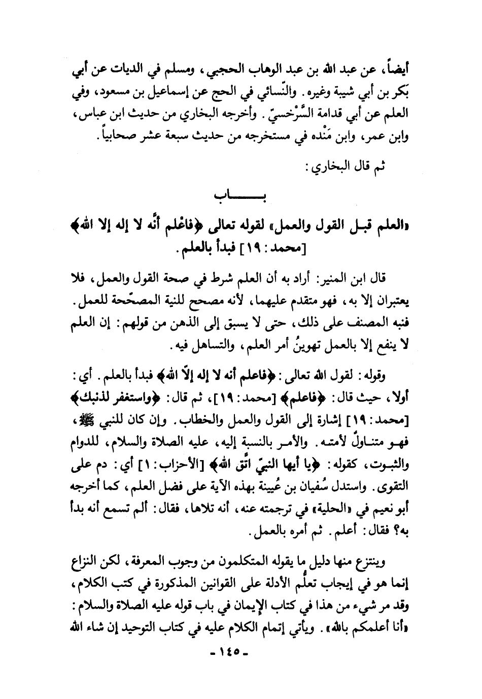 وقوله: لقول الله تعالى: {فَاعْلَمْ أَنَّهُ لَا إِلَهَ إِلَّا اللَّهُ} فبدأ بالعلم. أي: أولا، حيث قال: {فَاعْلَمْ} [محمد: 19]، ثم قال: {وَاسْتَغْفِرْ لِذَنْبِكَ} [محمد: 19] إشارة إلى القول والعمل والخطاب، وإن كان للنبي -صلى الله عليه وسلم-، فهو متناولٌ لأمته. والأمر بالنسبة إليه، عليه الصلاة والسلام، للدوام والثبوت، كقوله: {يَا أَيُّهَا النَّبِيُّ اتَّقِ اللَّهَ} [الأحزاب:1] أي: دم على التقوى. واستدل سُفيان بن عُيينة بهذه الآية على فضل العلم، كما أخرجه أبو نعيم في "الحلية" في ترجمته عنه، أنه تلاها، فقال: ألم تسمع أنه بدأ به؟ فقال: أعلم. ثم أمره بالعمل.