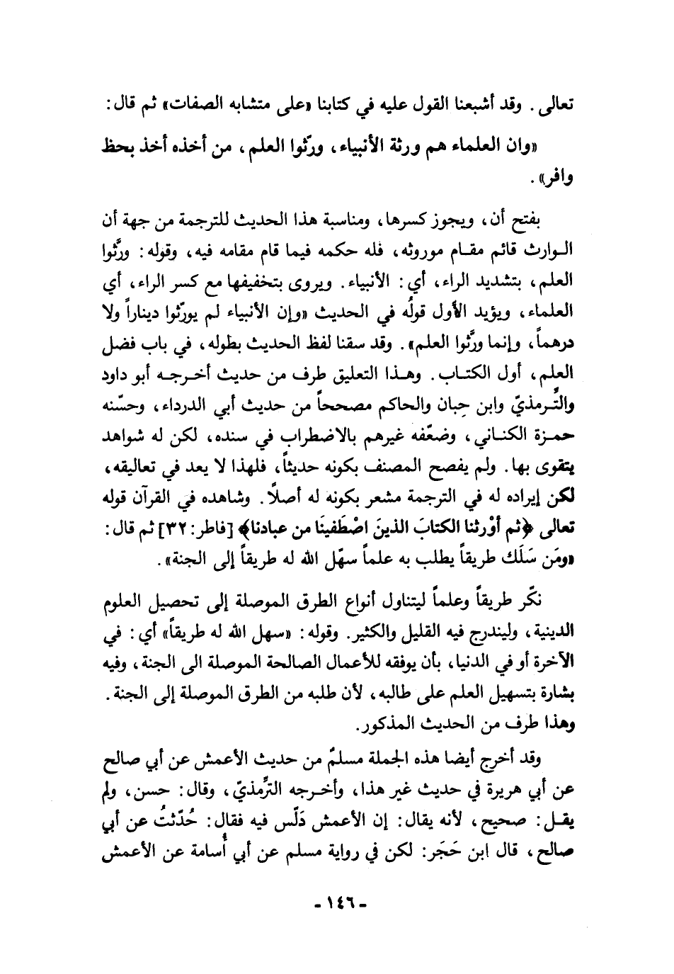 بفتح أن، ويجوز كسرها، ومناسبة هذا الحديث للترجمة من جهة أن الوارث قائم مقام موروثه، فله حكمه فيما قام مقامه فيه، وقوله: ورَّثوا العلم، بتشديد الراء، أي: الأنبياء. ويروى بتخفيفها مع كسر الراء، أي العلماء، ويؤيد الأول قولُه في الحديث "وإن الأنبياء لم يورّثوا دينارًا ولا درهمًا، وإنما ورَّثوا العلم". وقد سقنا لفظ الحديث بطوله، في باب فضل العلم، أول الكتاب. وهذا التعليق طرف من حديث أخرجه أبو داود والتِّرمذيّ وابن حِبان والحاكم مصححًا من حديث أبي الدرداء، وحسّنه حمزة الكناني، وضعّفه غيرهم بالاضطراب في سنده، لكن له شواهد يتقوى بها. ولم يفصح المصنف بكونه حديثًا، فلهذا لا يعد في تعاليقه، لكن إيراده له في الترجمة مشعر بكونه له أصلًا. وشاهده في القرآن قوله تعالى {ثُمَّ أَوْرَثْنَا الْكِتَابَ الَّذِينَ اصْطَفَيْنَا مِنْ عِبَادِنَا} [فاطر: 32] ثم قال: "ومَن سَلَك طريقًا يطلب به علمًا سهّل الله له طريقًا إلي الجنة".