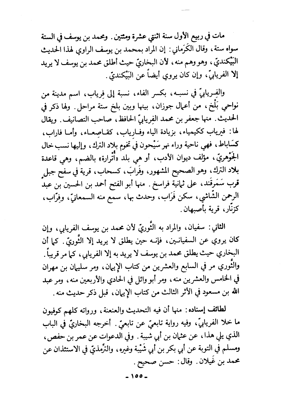 الثاني: سفيان، والمراد به الثَّوريّ لأن محمد بن يوسف الفريابي، وإن كان يروي عن السفيانين، فإنه حين يطلق لا يريد إلا الثَّوريّ. كما أن البخاري حيث يطلق محمد بن يوسف لا يريد به إلا الفريابي، كما مر قريبًا. والثَّوري مر في السابع والعشرين من كتاب الإِيمان، ومر سليمان بن مهران في الخامس والعشرين منه، ومر أبو وائل في الحادي والأربعين منه، ومر عبد الله بن مسعود في الأثر الثالث من كتاب الإِيمان، قبل ذكر حديث منه.