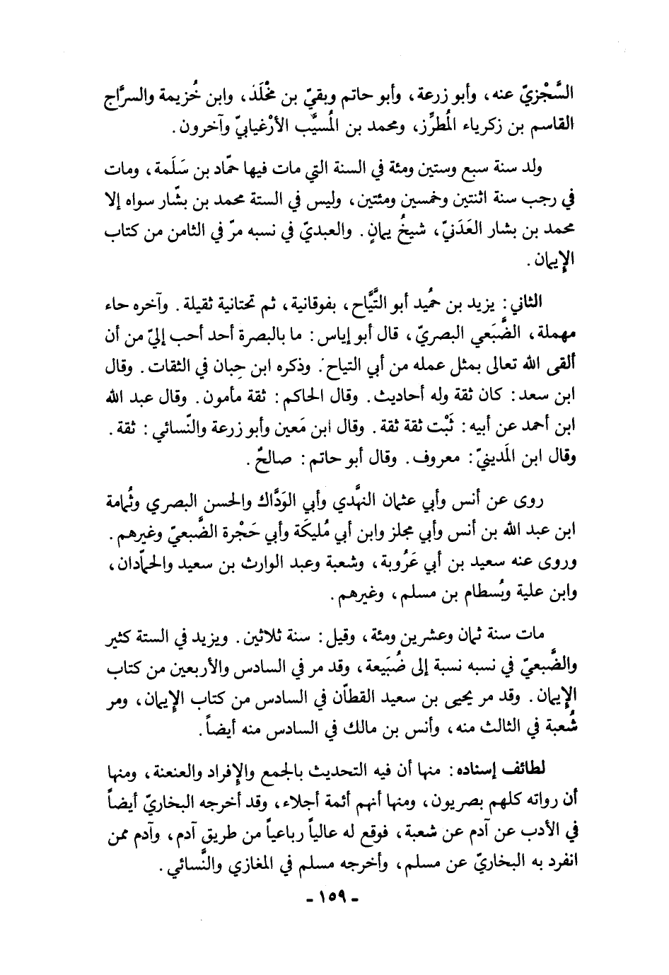 مات سنة ثمان وعشرين ومئة، وقيل: سنة ثلاثين. ويزيد في الستة كثير والضَّبعيّ في نسبه نسبة إلى ضُبَيعة، وقد مر في السادس والأربعين من كتاب الإِيمان. وقد مر يحيى بن سعيد القطّان في السادس من كتاب الإِيمان، ومر شُعبة في الثالث منه، وأنس بن مالك في السادس منه أيضًا.