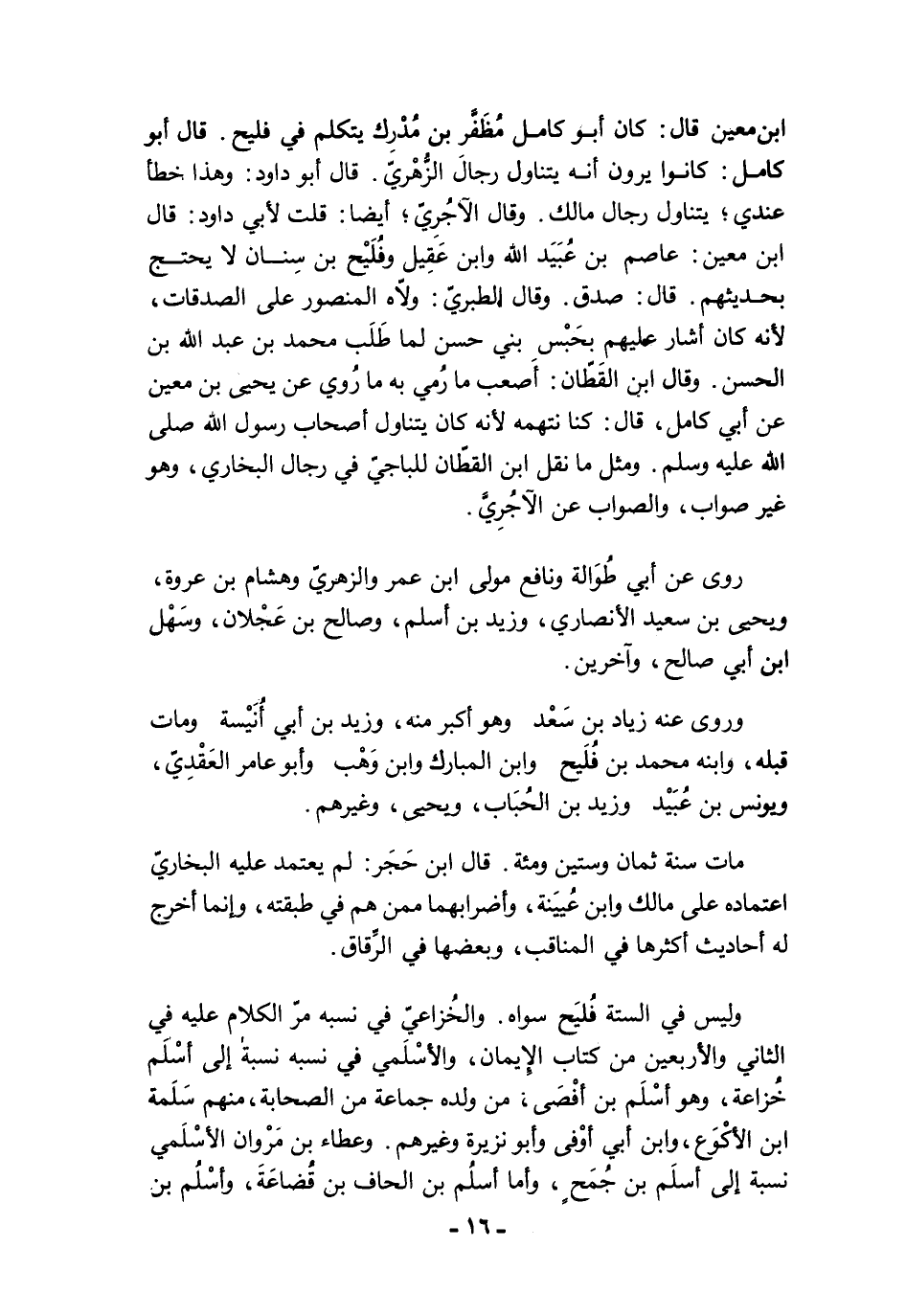 ابن معين قال: كان أبو كامل مُظَفَّر بن مُدْرِك يتكلم في فليح. قال أبو كامل: كانوا يرون أنه يتناول رجالَ الزُّهْريّ. قال أبو داود: وهذا خطأ عندي؛ يتناول رجال مالك. وقال الآجُرِيّ؛ أيضًا: قلت لأبي داود: قال ابن معين: عاصم بن عُبَيَد الله وابن عَقِيل وفُلَيْح بن سِنان لا يحتج بحديثهم. قال: صدق. وقال الطبريّ: ولاّه المنصور على الصدقات، لأنه كان أشار عليهم بحَبْس بني حسن لما طَلَب محمد بن عبد الله بن الحسن. وقال ابن القَطّان: أَصعب ما رُمي به ما رُوي عن يحيى بن معين عن أبي كامل، قال: كنا نتهمه لأنه كان يتناول أصحاب رسول الله صلى الله عليه وسلم. ومثل ما نقل ابن القطّان للباجيّ في رجال البخاري، وهو غير صواب، والصواب عن الآجُرِيَّ.