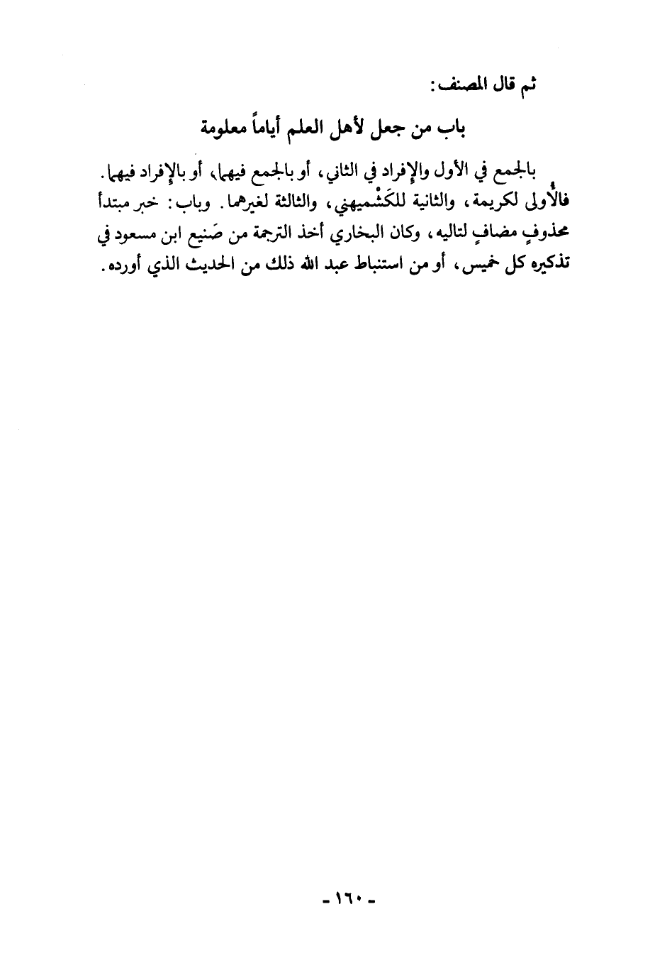 بالجمع في الأول والإِفراد في الثاني، أو بالجمع فيهما، أو بالإِفراد فيهما. فالأُولى لكريمة، والثانية للكَشْميهني، والثالثة لغيرهما. وباب: خبر مبتدأ محذوفٍ مضافٍ لتاليه، وكان البخاري أخذ الترجمة من صَنيع ابن مسعود في تذكيره كل خميس، أو من استنباط عبد الله ذلك من الحديث الذي أورده.