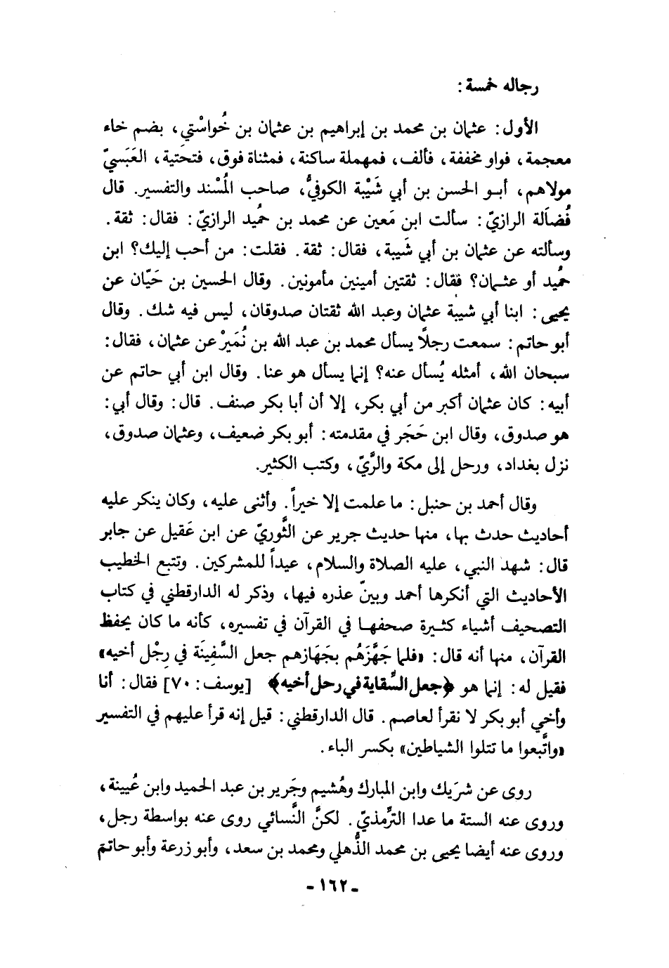 الأول: عثمان بن محمد بن إبراهيم بن عثمان بن خُواسْتي، بضم خاء معجمة، فواو مخففة، فألف، فمهملة ساكنة، فمثناة فوق، فتحتية، العَبَسيّ مولاهم، أبو الحسن بن أبي شَيْبة الكوفيُّ، صاحب المُسْند والتفسير. قال فُضاَلة الرازيّ: سألت ابن مَعين عن محمد بن حمُيد الرازيّ: فقال: ثقة. وسألته عن عثمان بن أبي شَيبة، فقال: ثقة. فقلت: من أحب إليك؟ ابن حُميد أو عثمان؟ قفال: ثقتين أمينين مأمونين. وقال الحسين بن حَيّان عن يحيى: ابنا أبي شيبة عثمان وعبد الله ثقتان صدوقان، ليس فيه شك. وقال أبو حاتم: سمعت رجلًا يسأل محمد بن عبد الله بن نُمَيرْ عن عثمان، فقال: سبحان الله، أمثله يُسال عنه؟ إنما يسأل هو عنا. وقال ابن أبي حاتم عن أبيه: كان عثمان أكبر من أبي بكر، إلا أن أبا بكر صنف. قال: وقال أبي: هو صدوق، وقال ابن حَجَر في مقدمته: أبو بكر ضعيف، وعثمان صدوق، نزل بغداد، ورحل إلى مكة والرَّيّ، وكتب الكثير.