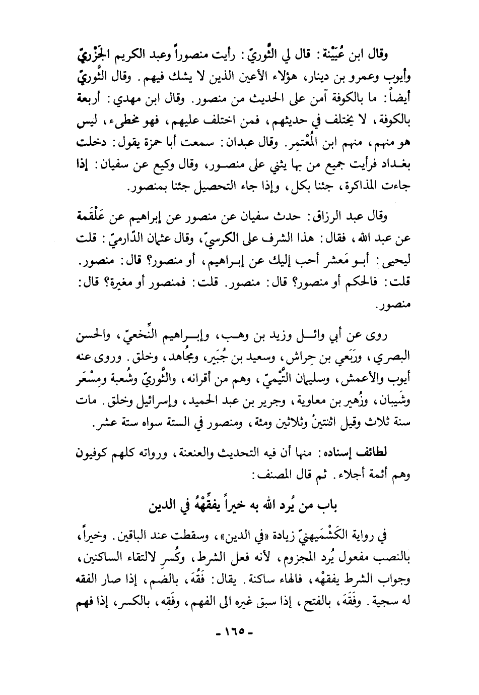 وقال عبد الرزاق: حدث سفيان عن منصور عن إبراهيم عن عَلْقَمة عن عبد الله، فقال: هذا الشرف على الكرسيّ، وقال عثمان الدّارميّ: قلت ليحيى: أبو مَعشر أحب إليك عن إبراهيم، أو منصور؟ قال: منصور. قلت: فالحكم أو منصور؟ قال: منصور. قلت: فمنصور أو مغيرة؟ قال: منصور.