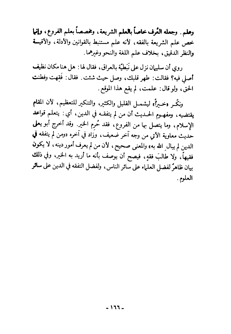 وعلم. وجعله العُرف خاصًا بالعلم الشريعة، ومخصصًا بعلم الفروع، وإنما خص علم الشريعة بالفقه، لأنه علم مستنبط بالقوانين والأدلة، والأقيسة والنظر الدقيق، بخلاف علم اللغة والنحو وغيرهما.