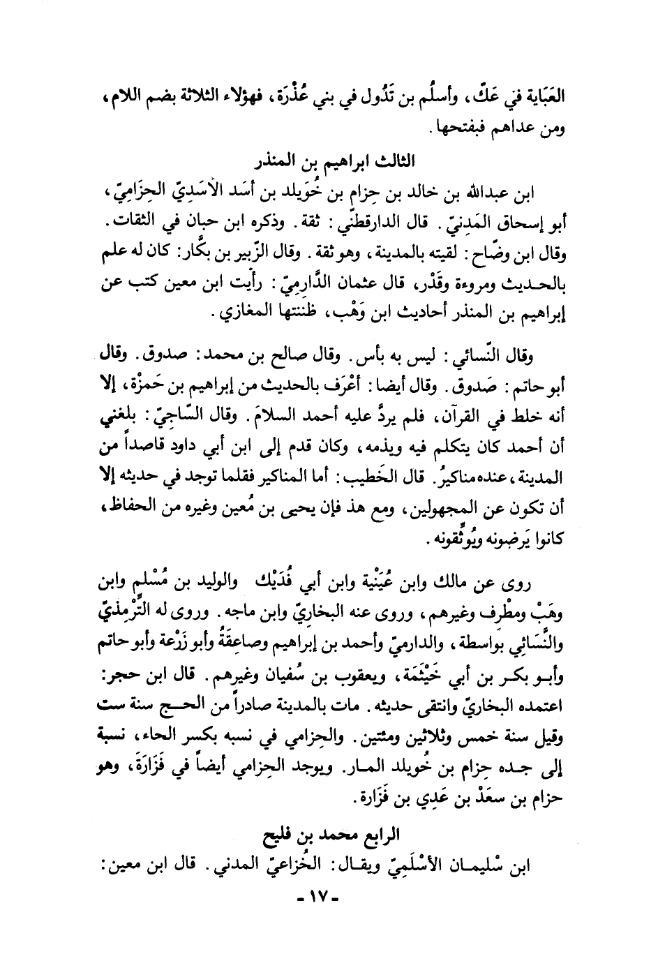 ابن عبد الله بن خالد بن حِزام بن خُوَيلد بن أسَد الأسَدِيّ الحِزَامِيّ، أبو إسحاق المَدِنيّ. قال الدارقطنّي: ثقة. وذكره ابن حبان في الثقات. وقال ابن وضّاح: لقيته بالمدينة، وهو ثقة. وقال الزّبير بن بكَّار: كان له علم بالحديث ومروءة وقَدْر، قال عثمان الدَّارمِيّ: رأيت ابن معين كتب عن إبراهيم بن المنذر أحاديث ابن وَهْب، ظننتها المغازي.