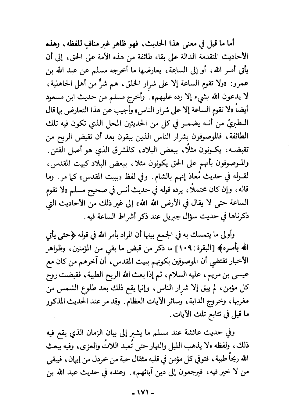 أما ما قيل في معنى هذا الحديث، فهو ظاهر غير منافٍ للفظه، وهذه الأحاديث المتقدمة الدالة على بقاء طائفة من هذه الأمة على الحق، إلى أن يأتي أمر الله، أو إلى الساعة، يعارضها ما أخرجه مسلم عن عبد الله بن عمرو: "ولا تقوم الساعة إلا على شرِار الخلق، هم شرٌّ من أهل الجاهلية، لا يدعون الله بشيء إلا رده عليهم". وأخرج مسلم من حديث ابن مسعود أيضًا "لا تقوم الساعة إلا على شرار الناس" وأجيب عن هذا التعارض بما قال الطبريّ من أنه يضمر في كل من الحديثين المحل الذي تكون فيه تلك الطائفة، فالموصوفون بشرار الناس الذين يبقون بعد أن تقبض الريح من تقبضه، يكونون مثلًا، ببعض البلاد، كالمشرق الذي هو أصل الفتن. والموصوفون بأنهم على الحق يكونون مثلا، ببعض البلاد كبيت المقدس، لقوله في حديث مُعاذ إنهم بالشام. وفي لفظ "ببيت المقدس" كما مر. وما قاله، وإن كان محتملًا، يرده قوله في حديث أنس في صحيح مسلم "لا تقوم الساعة حتى لا يقال في الأرض الله الله" إلى غير ذلك من الأحاديث التي ذكرناها في حديث سؤال جبريل عند ذكر أشراط الساعة فيه.