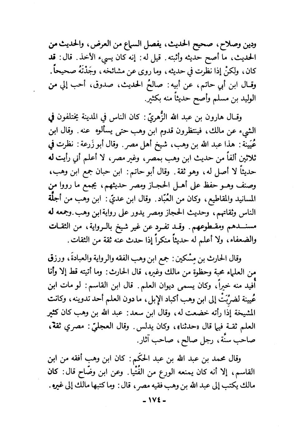 وقال هارون بن عبد الله الزُّهريّ: كان الناس في المدينة يختلفون في الشيء عن مالك، فينتظرون قدوم ابن وهب حتى يسألوه عنه. وقال ابن عُيَينة: هذا عبد الله بن وهب، شيخ أهل مصر. وقال أبو زَرعة: نظرت في ثلاثين ألفًا من حديث ابن وهب بمصر، وغير مصر، لا أعلم أني رأيت له حديثًا لا أصل له، وهو ثقة. وقال أبو حاتم: ابن حبان جمع ابن وهب، وصنف وهو حفظ على أهل الحجاز ومصر حديثهم، يجمع ما رووا من المسانيد والمقاطيع، وكان من العُبّاد. وقال ابن عديّ: ابن وهب من أجلَّة الناس وثقاتهم، وحديث الحجاز ومصر يدور على رواية ابن وهب. وجمعه له مسندهم ومقطوعهم. وقد تفرد عن غير شيخ بالرواية، من الثقات والضعفاء، ولا أعلم له حديثًا منكرًا إذا حدث عنه ثقة من الثقات.