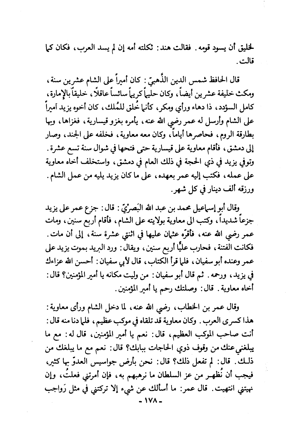 وقال عمر بن الخطاب، -رضي الله عنه-، لما دخل الشام ورأى معاوية: هذا كسرى العرب. وكان معاوية قد تلقاه في موكب عظيم، فلما دنا منه قال: أنت صاحب الموكب العظيم، قال: نعم يا أمير المؤمنين، قال له: مع ما يبلغني عنك من وقوف ذوي الحاجات ببابك؟ قال: نعم مع ما يبلغك من ذلك. قال: لم تفعل ذلك؟ قال: نحن بأرض جواسيس العدوّ بها كثير، فيجب أن نُظهر من عز السلطان ما نرهبهم به، فإن أمرتني فعلتُ، وإن نهيتني انتهيت. قال عمر: ما أسألك عن شيء إلا تركتني في مثل رَواجب