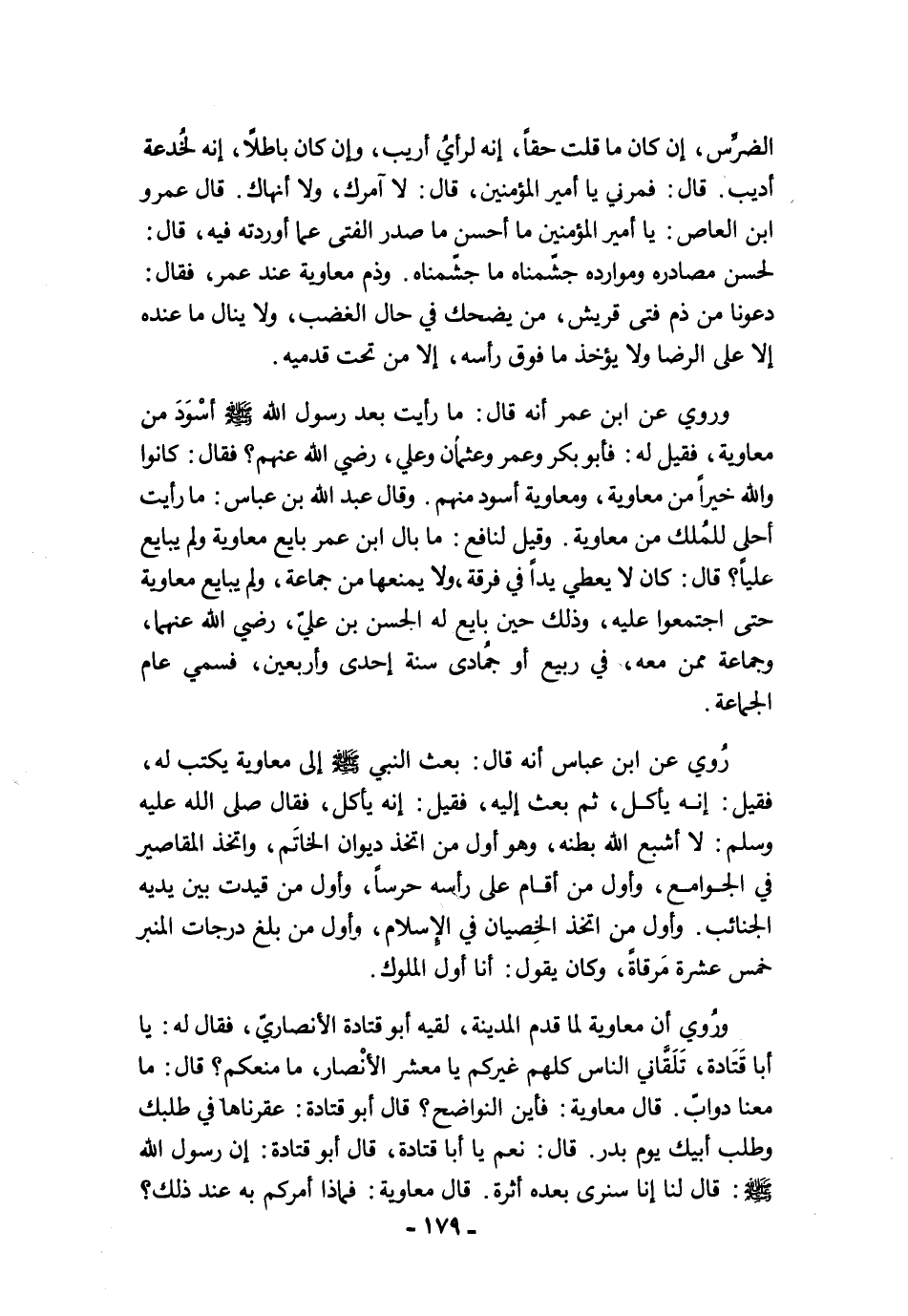 وروي عن ابن عمر أنه قال: ما رأيت بعد رسول الله -صلى الله عليه وسلم- أسْوَدَ من معاوية، فقيل له: فأبو بكر وعمر وعثمان وعلي، رضي الله عنهم؟ فقال: كانوا والله خيرًا من معاوية، ومعاوية أسود منهم. وقال عبد الله بن عباس: ما رأيت أحلى للمُلك من معاوية. وقيل لنافع: ما بال ابن عمر بايع معاوية ولم يبايع عليًا؟ قال: كان لا يعطي يدًا في فرقة، ولا يمنعها من جماعة، ولم يبايع معاوية حتى اجتمعوا عليه، وذلك حين بايع له الحسن بن عليّ، رضي الله عنهما، وجماعة ممن معه، في ربيع أو جمادى سنة إحدى وأربعين، فسمي عام الجماعة.
