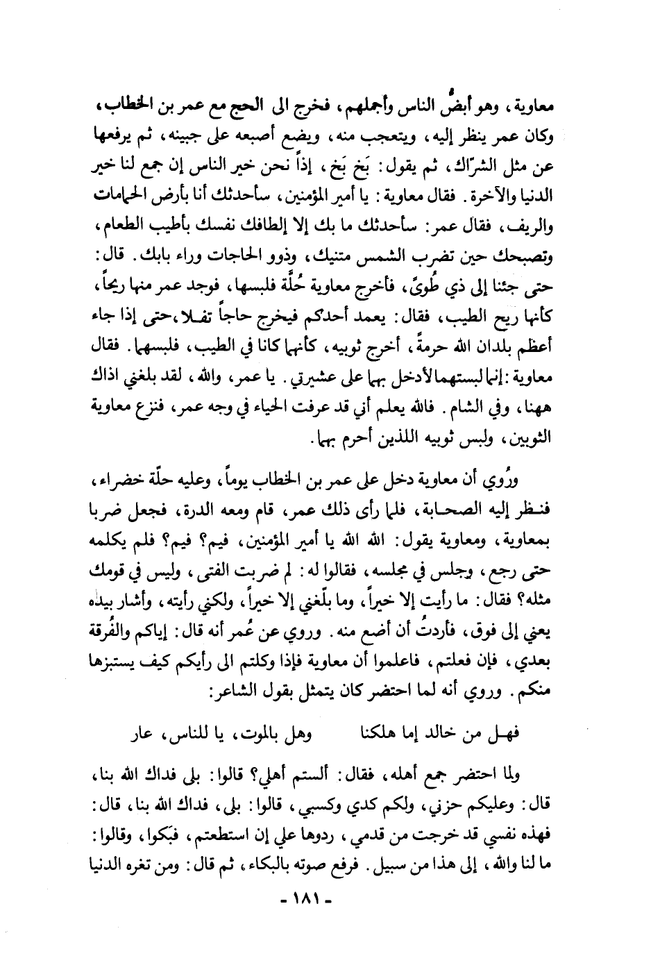 معاوية، وهو أبضُّ الناس وأجملهم، فخرج إلى الحج مع عمر بن الخطاب، وكان عمر ينظر إليه، ويتعجب منه، ويضع أصبعه على جبينه، ثم يرفعها عن مثل الشرّاك، ثم يقول: بَخ بَخ، إذًا نحن خير الناس إن جمع لنا خير الدنيا والآخرة. فقال معاوية: يا أمير المؤمنين، سأحدثك أنا بأرض الحمامات والريف، فقال عمر: سأحدثك ما بك إلا إلطافك نفسك بأطيب الطعام، وتصبحك حين تضرب الشمس متنيك، وذوو الحاجات وراء بابك. قال: حتى جئنا إلى ذي طُوىً، فأخرج معاوية حُلَّة فلبسها، فوجد عمر منها ريحًا، كأنها ريح الطيب، فقال: يعمد أحدكم فيخرج حاجًا تفلا، حتى إذا جاء أعظم بلدان الله حرمةً، أخرج ثوبيه، كأنهما كانا في الطيب، فلبسهما. فقال معاوية: إنما لبستهما لأدخل بهما على عشيرتي. يا عمر، والله، لقد بلغني اذاك هاهنا، وفي الشام. فالله يعلم أني قد عرفت الحياء في وجه عمر، فنزع معاوية الثوبين، ولبس ثوبيه اللذين أحرم بهما.
