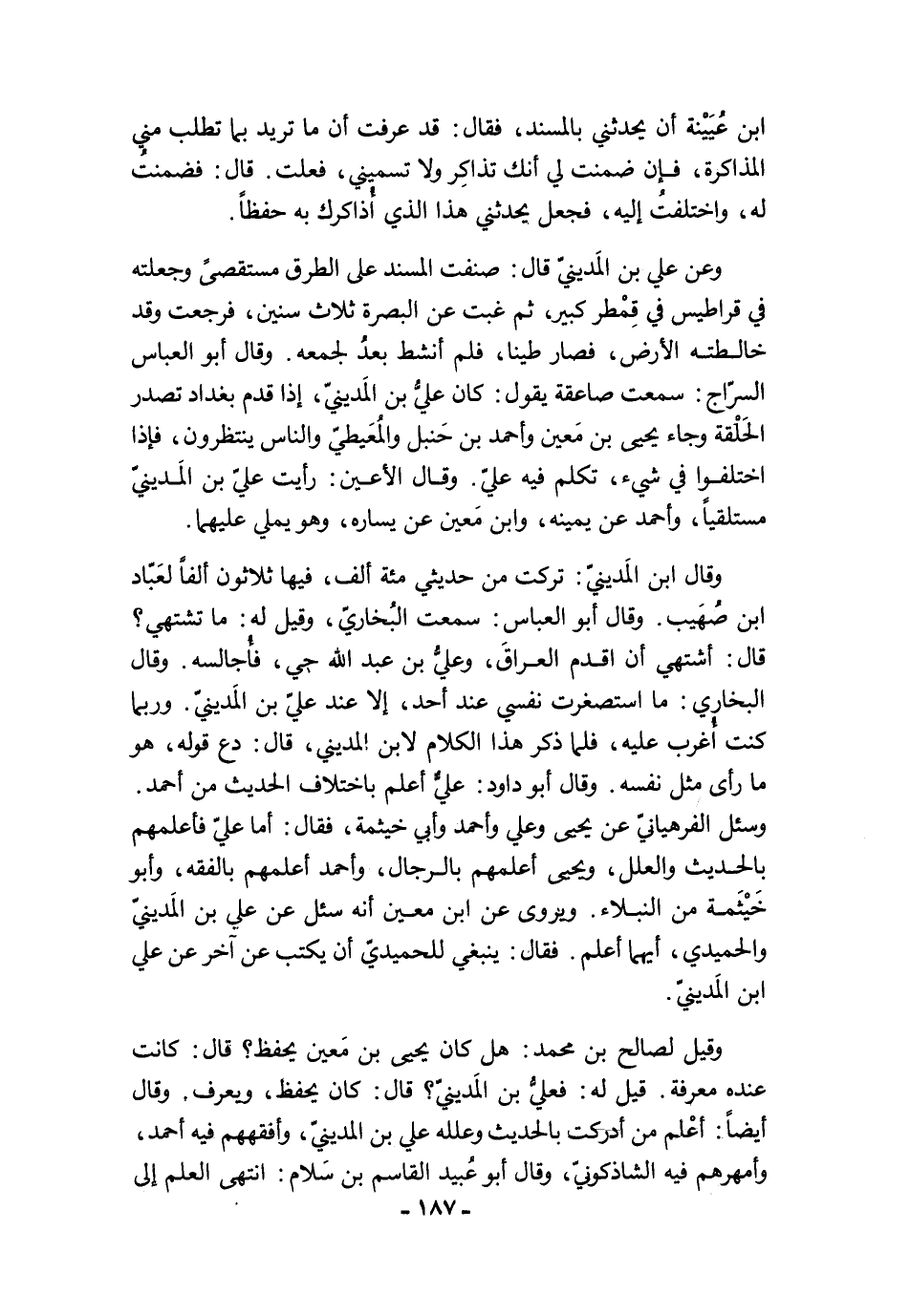 وقيل لصالح بن محمد: هل كان يحيى بن مَعين يحفظ؟ قال: كانت عنده معرفة. قيل له: فعليُّ بن المَدينيّ؟ قال: كان يحفظ، ويعرف. وقال أيضًا: أعْلم من أدركت بالحديث وعلله علي بن المدينيّ، وأفقههم فيه أحمد، وأمهرهم فيه الشاذكونيّ، وقال أبو عبيد القاسم بن سَلام: انتهى العلم إلى