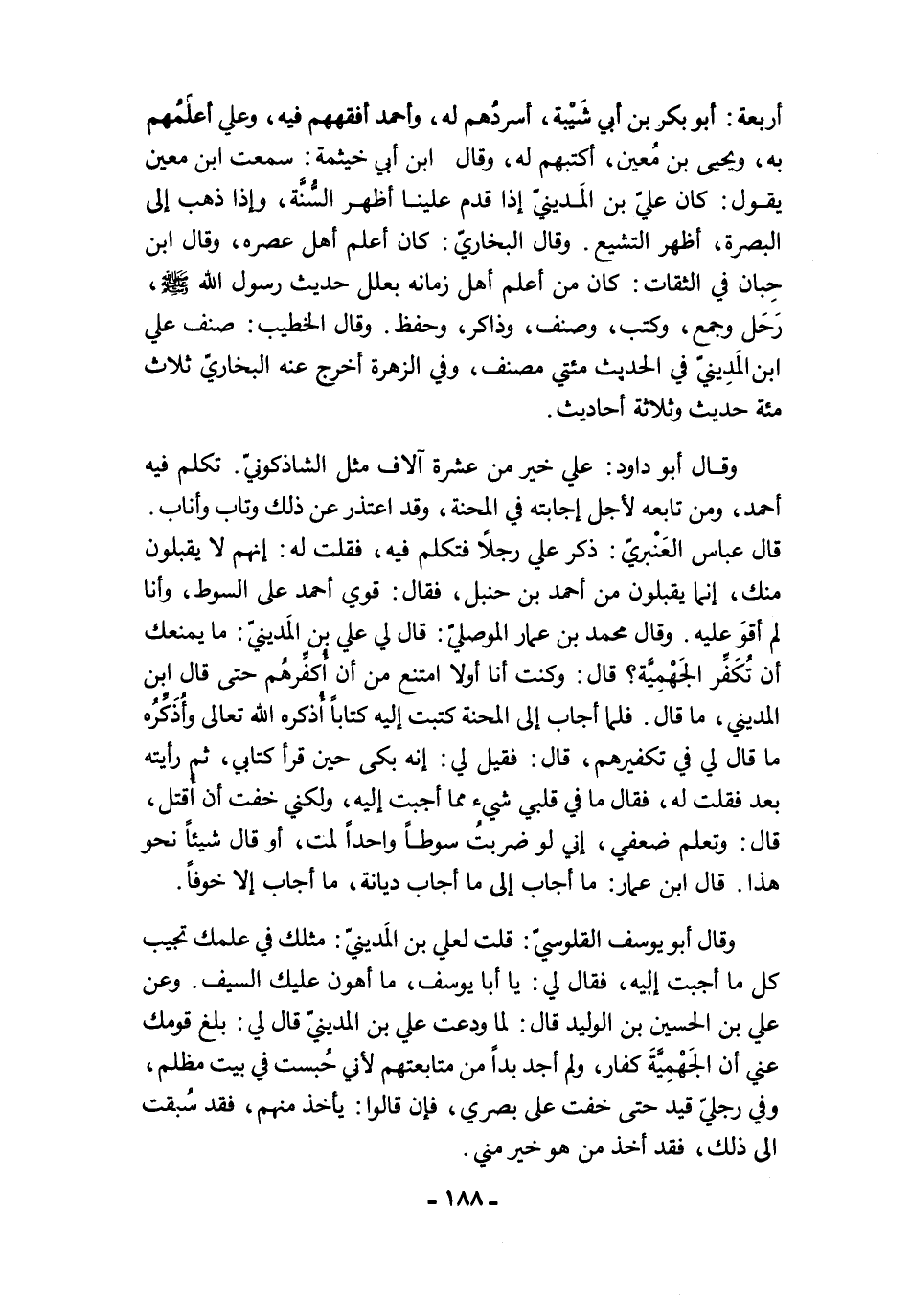 وقال أبو داود: علي خير من عشرة آلاف مثل الشاذكونيّ. تكلم فيه أحمد، ومن تابعه لأجل إجابته في المحنة، وقد اعتذر عن ذلك وتاب وأناب. قال عباس العَنْبريّ: ذكر علي رجلًا فتكلم فيه، فقلت له: إنهم لا يقبلون منك، إنما يقبلون من أحمد بن حنبل، فقال: قوي أحمد على السوط، وأنا لم أقوَ عليه. وقال محمد بن عمار الموصليّ: قال لي علي بن المَدينيّ: ما يمنعك أن تُكَفِّر الجَهْمِيَّة؟ قال: وكنت أنا أولا امتنع من أن أُكفِّرهُم حتى قال ابن المديني، ما قال. فلما أجاب إلى المحنة كتبت إليه كتابًا أُذكره الله تعالى وأُذَكِّرُه ما قال لي في تكفيرهم، قال: فقيل لي: إنه بكى حين قرأ كتابي، ثم رأيته بعد فقلت له، فقال ما في قلبي شيء مما أجبت إليه، ولكني خفت أن أُقتل، قال: وتعلم ضعفي، إني لو ضربتُ سوطًا واحدًا لمت، أو قال شيئًا نحو هذا. قال ابن عمار: ما أجاب إلى ما أجاب ديانة، ما أجاب إلا خوفًا.