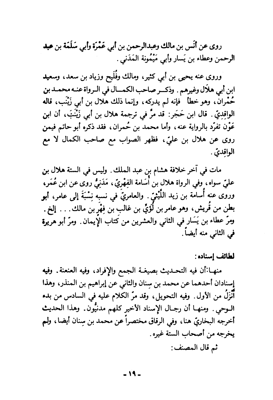 مات في آخر خلافة هشام بن عبد الملك. وليس في الستة هلال بن عليّ سواه، وفي الرواة هلال بن أُسَامة الفِهْرِيّ، مَدَنِيّ روى عن ابن عُمَر، وروى عنه أُسامة بن زيد اللَّيْثيّ. والعامريّ في نسبِه نِسْبَةَ إلى عامر، أبو بطن من قُريش، وهو عامر بن لؤيِّ بن غالب بن فِهْرٍ بن مالك ... الخ. ومرّ عطاء بن يَسَار في الثاني والعشرين من كَتاب الإيمان. ومرّ أبو هريرة في الثاني منه أيضًا.