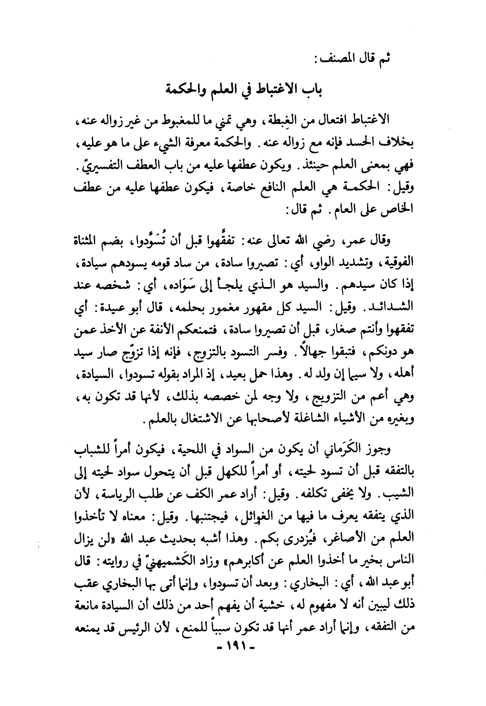 وجوز الكَرَماني أن يكون من السواد في اللحية، فيكون أمرًا للشباب بالتفقه قبل أن تسود لحيته، أو أمرًا للكهل قبل أن يتحول سواد لحيته إلى الشيب. ولا يخفى تكلفه. وقيل: أراد عمر الكف عن طلب الرياسة، لأن الذي يتفقه يعرف ما فيها من الغوائل، فيجتنبها. وقيل: معناه لا تأخذوا العلم من الأصاغر، فيُزدرى بكم. وهذا أشبه بحديث عبد الله "لن يزال الناس بخير ما أخذوا العلم عن أكابرهم" وزاد الكَشميهنيّ في روايته: قال أبو عبد الله، أي: البخاري: وبعد أن تسودوا، وإنما أتى بها البخاري عقب ذلك ليبين أنه لا مفهوم له، خشية أن يفهم أحد من ذلك أن السيادة مانعة من التفقه، وإنما أراد عمر أنها قد تكون سببًا للمنع، لأن الرئيس قد يمنعه