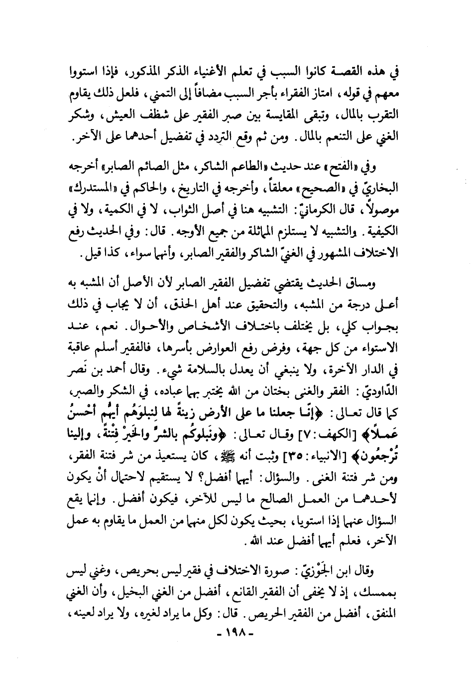 وقال ابن الجَوْزيّ: صورة الاختلاف في فقير ليس بحريص، وغني ليس بممسك، إذ لا يخفى أن الفقير القانع، أفضل من الغني البخيل، وأن الغني المنفق، أفضل من الفقير الحريص. قال: وكل ما يراد لغيره، ولا يراد لعينه،