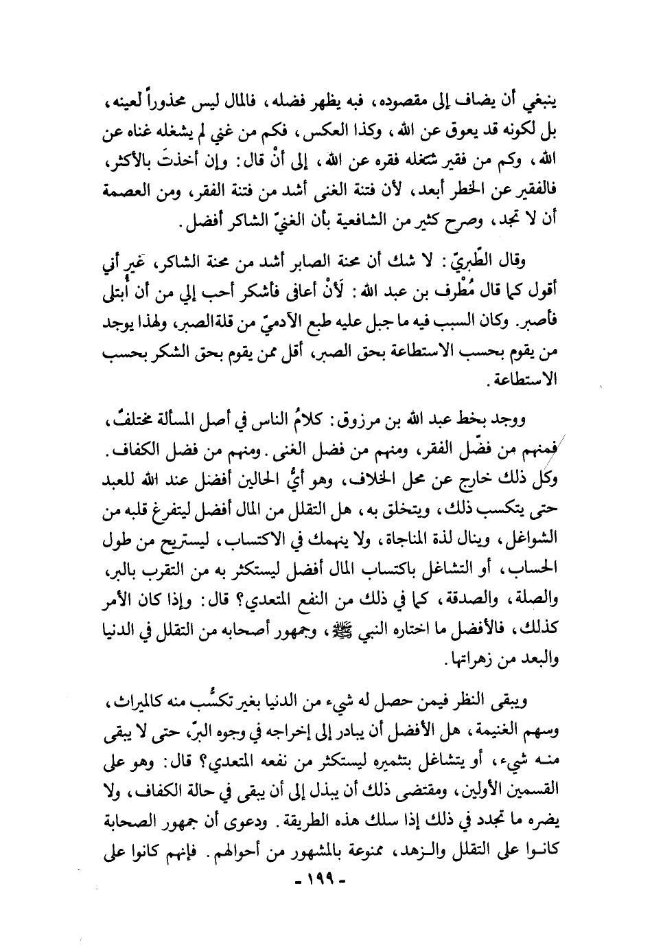 ووجد بخط عبد الله بن مرزوق: كلامُ الناس في أصل المسألة مختلفٌ، فمنهم من فضّل الفقر، ومنهم من فضل الغنى. ومنهم من فضل الكفاف. وكل ذلك خارج عن محل الخلاف، وهو أيُّ الحالين أفضل عند الله للعبد حتى يتكسب ذلك، ويتخلق به، هل التقلل من المال أفضل ليتفرغ قلبه من الشواغل، وينال لذة المناجاة، ولا ينهمك في الاكتساب، ليستريح من طول الحساب، أو التشاغل باكتساب المال أفضل ليستكثر به من التقرب بالبر، والصلة، والصدقة، كما في ذلك من النفع المتعدي؟ قال: وإذا كان الأمر كذلك، فالأفضل ما اختاره النبي -صلى الله عليه وسلم-، وجمهور أصحابه من التقلل في الدنيا والبعد من زهراتها.