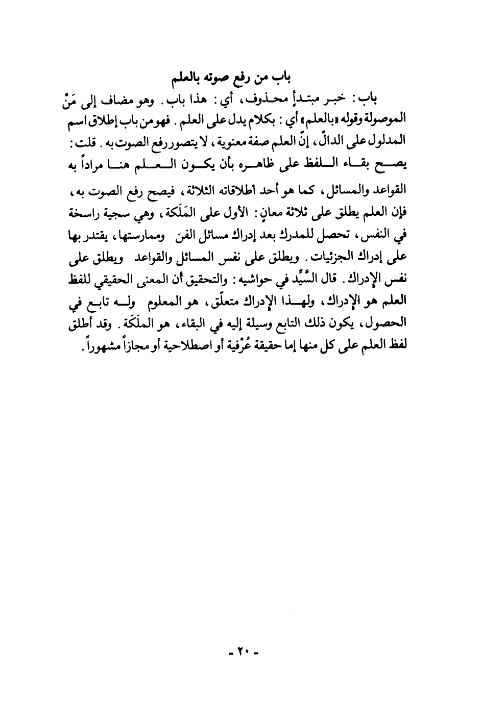 باب: خبر مبتدأٍ محذوف، أي: هذا باب. وهو مضاف إلى مَنْ الموصولة وقوله "بالعلم" أي: بكلام يدل على العلم. فهو من باب إطلاق اسم المدلول على الدالّ، إنّ العلم صفة معنوية، لا يتصور رفع الصوت به. قلت: يصح بقاء اللفظ على ظاهره بأن يكون العلم هنا مرادًا به القواعد والمسائل، كما هو أحد أطلاقاته الثلاثة، فيصح رفع الصوت به، فإن العلم يطلق على ثلاثة معانٍ: الأول على المَلَكة، وهي سجية راسخة في النفس، تحصل للمدرك بعد إدراك مسائل الفن وممارستها، يقتدر بها على إدراك الجزئيات. ويطلق على نفس المسائل والقواعد ويطلق على نفس الإدراك. قال السَّيِّد في حواشيه: والتحقيق أن المعنى الحقيقي للفظ العلم هو الإدراك، ولهذا الإدراك متعلق، هو المعلوم وله تابع في الحصول، يكون ذلك التابع وسيلة إليه في البقاء، هو الملَكَة. وقد أطلق لفظ العلم على كل منها إما حقيقة عُرْفية أو اصطلاحية أو مجازًا مشهورًا.
