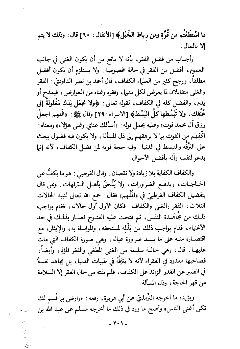 وأجاب من فضل الفقر، بأنه لا مانع من أن يكون الغنى في جانب العموم، أفضل من الفقر في حالة مخصوصة. ولا يستلزم أن يكون أفضل مطلقًا، ورجح كثير من العلماء الكفاف، قال أحمد بن نصر الداوديّ: الفقر والغنى متقابلان لما يعرض لكل منهما، وفقره وغناه من العوارض، فيمدح أو يذم، والفضل كله في الكفاف، لقوله تعالى: {وَلَا تَجْعَلْ يَدَكَ مَغْلُولَةً إِلَى عُنُقِكَ وَلَا تَبْسُطْهَا كُلَّ الْبَسْطِ} [الإسراء: 29] وقال -صلى الله عليه وسلم- "الّلهم اجعلْ رزق آل محمد قوت" وعليه يحمل قوله: "أسألك غناي وغنى هؤلاء" ومعناه: اكْفِهم من القوت بما لا يرهقهم إلى ذل المسألة، ولا يكون فيه فضول يبعث على التَّرفُّه والتبسط في الدنيا. وفيه حجة قوية لمن فضل الكفاف، لأنه إنما يدعو لنفسه وآله بأفضل الأحوال.
