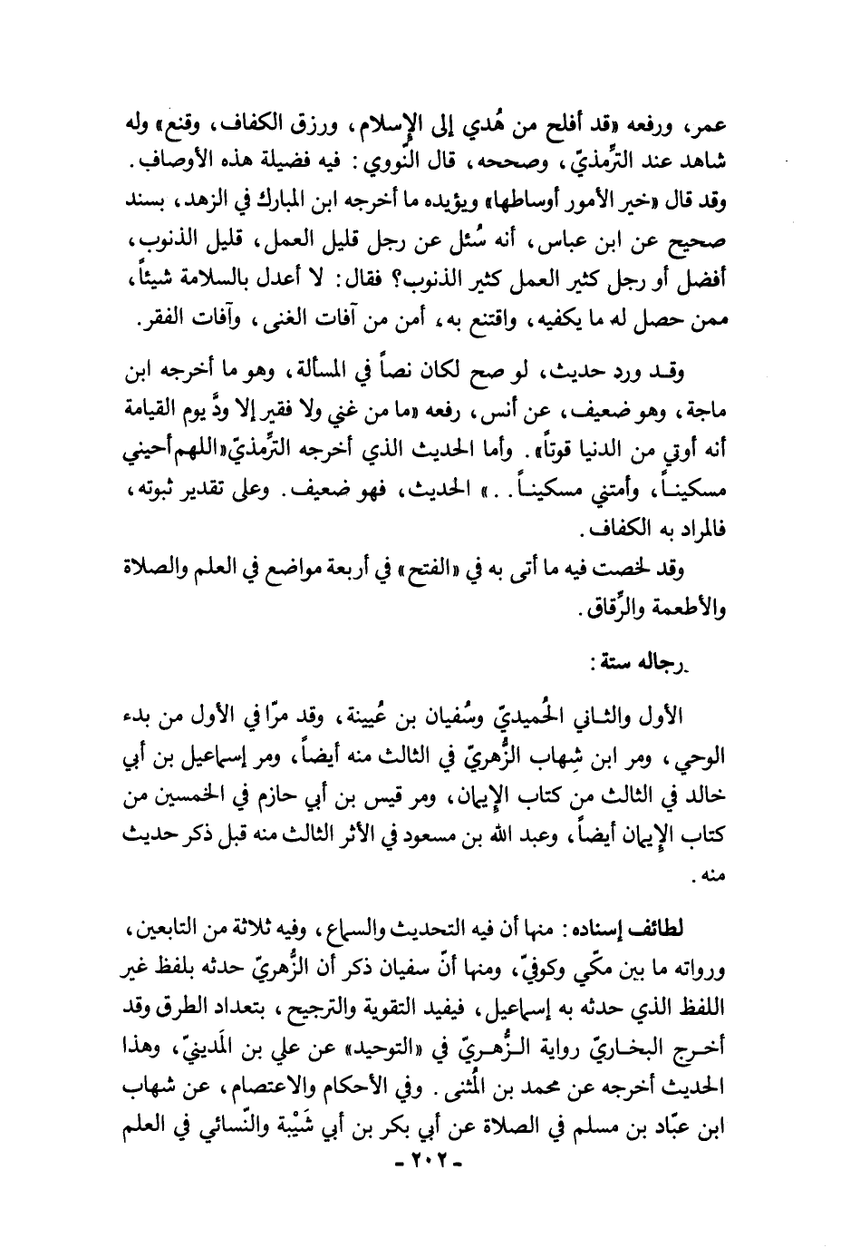 عمر، ورفعه "قد أفلح من هُدي إلى الإِسلام، ورزق الكفاف، وقنع" وله شاهد عند التِّرمذيّ، وصححه، قال النّووي: فيه فضيلة هذه الأوصاف. وقد قال "خير الأمور أوساطها" ويؤيده ما أخرجه ابن المبارك في الزهد، بسند صحيح عن ابن عباس، أنه سُئل عن رجل قليل العمل، قليل الذنوب، أفضل أو رجل كثير العمل كثير الذنوب؟ فقال: لا أعدل بالسلامة شيئًا، ممن حصل له ما يكفيه، واقتنع به، أمن من آفات الغنى، وآفات الفقر.