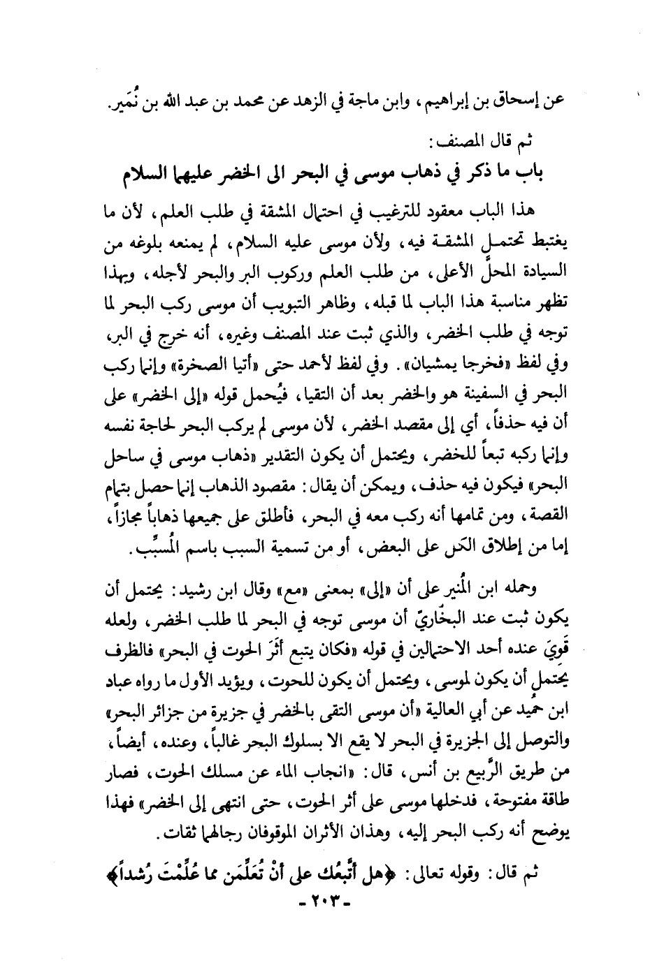 وحمله ابن المُنير على أن "إلى" بمعنى "مع" وقال ابن رشيد: يحتمل أن يكون ثبت عند البخاريّ أن موسى توجه في البحر لما طلب الخضر، ولعله قَوِيَ عنده أحد الاحتمالين في قوله "فكان يتبع أثَرَ الحوت في البحر" فالظرف يحتمل أن يكون لموسى، ويحتمل أن يكون للحوت، ويؤيد الأول ما رواه عباد ابن حُميد عن أبي العالية "أن موسى التقى بالخضر في جزيرة من جزائر البحر" والتوصل إلى الجزيرة في البحر لا يقع إلا بسلوك البحر غالبًا، وعنده، أيضًا، من طريق الرَّبيع بن أنس، قال: "انجاب الماء عن مسلك الحوت، فصار طاقة مفتوحة، فدخلها موسى على أثر الحوت، حتى انتهى إلى الخضر" فهذا يوضح أنه ركب البحر إليه، وهذان الأثران الموقوفان رجالهما ثقات.