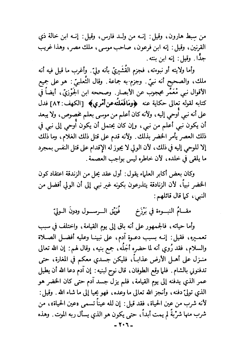وكان بعض أكابر العلماء يقول: أول عقد يحل من الزندقة اعتقاد كون الخضر نبيًا، لأن الزنادقة يتذرعون بكونه غير نبي إلى أن الولي أفضل من النبي، كما قال قائلهم: