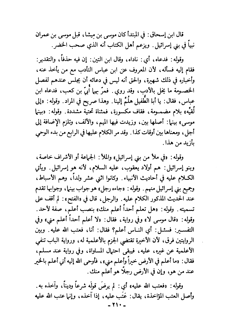 وقوله: "في ملأ من بني إسرائيل" والملأ: الجماعة أو الأشراف خاصة، وبنو إسرائيل: هم أولاد يعقوب، عليه السلام، لأنه هو إسرائيل. ويأتي الكلام عليه في أحاديث الأنبياء. وكانوا اثني عشر ولدًا، وهم الأسباط، وجميع بني إسرائيل منهم. وقوله: "جاءه رجل" هو جواب بينما، وجوابها تقدم عند الحديث المذكور الكلام عليه. والرجل، قال في "الفتح": لم أقف على تسميته. وقوله: "هل تعلم أحدًا أعلم منك" بنصب أعلم، صفة لأحد. وقوله: "قال موسى لا" وفي رواية، فقال: "لا أعلم أحدًا أعلم مني" وفي التفسير: فسئل: أي الناس أعلم؟ فقال: أنا، فعتب الله عليه. وبين الروايتين فرق، لأن الأخيرة تقتضي الجزم بالأعلمية له، ورواية الباب تنفي الأعلمية عن غيره، عليه، فيبقى احتمال المساواة، وفي رواية عند مسلم، فقال: "ما أعلم في الأرض خيرًا وأعلم مني"، فأوحى الله إليه أني أعلم بالخير عند من هو، وإن في الأرض رجلًا هو أعلم منك.