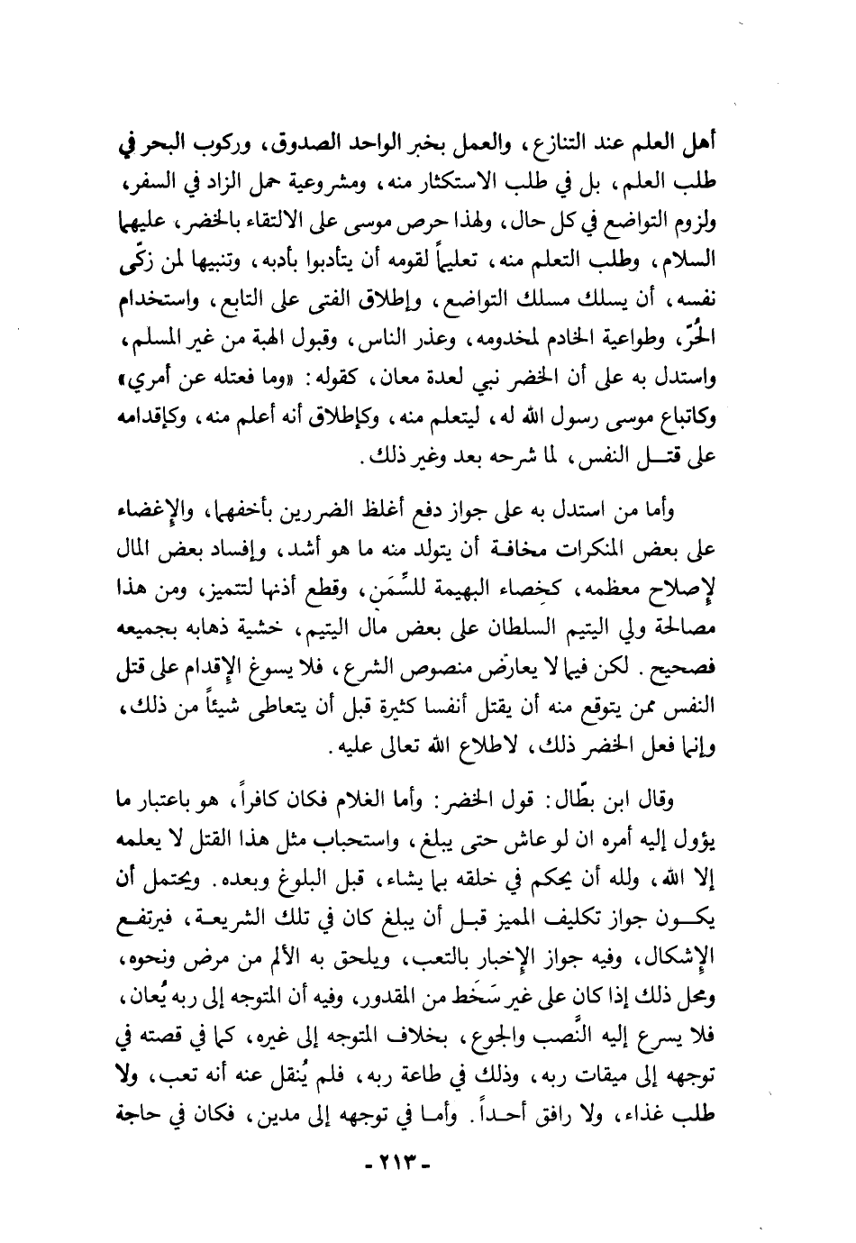 أهل العلم عند التنازع، والعمل بخبر الواحد الصدوق، وركوب البحر في طلب العلم، بل في طلب الاستكثار منه، ومشروعية حمل الزاد في السفر، ولزوم التواضع في كل حال، ولهذا حرص موسى على الالتقاء بالخضر، عليهما السلام، وطلب التعلم منه، تعليمًا لقومه أن يتادبوا بأدبه، وتنبيها لمن زكّى نفسه، أن يسلك مسلك التواضع، وإطلاق الفتى على التابع، واستخدام الحُر، وطواعية الخادم لمخدومه، وعذر الناس، وقبول الهبة من غير المسلم، واستدل به على أن الخضر نبي لعدة معان، كقوله: "وما فعتله عن أمري" وكاتباع موسى رسول الله له، ليتعلم منه، وكإطلاق أنه أعلم منه، وكإقدامه على قتل النفس، لما شرحه بعد وغير ذلك.