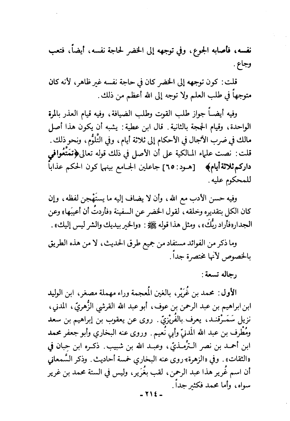 وفيه أيضًا جواز طلب القوت وطلب الضيافة، وفيه قيام العذر بالمرة الواحدة، وقيام الحجة بالثانية. قال ابن عطية: يشبه أن يكون هذا أصل مالك في ضرب الآجال في الأحكام إلى ثلاثة أيام، وفي التَّلَّوم، ونحو ذلك. قلت: نصت علماء المالكية على أن الأصل في ذلك قوله تعالى {تَمَتَّعُوا فِي دَارِكُمْ ثَلَاثَةَ أَيَّامٍ} [هود: 65] جاعلين الجامع بينهما كون الحكم عذابًا للمحكوم عليه.