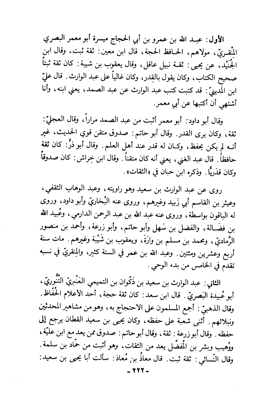 الأول: عبد الله بن عمرو بن أبي الحجاج ميسرة أبو معمر البصري المِنْقريّ، مولاهم، الحافظ الحجة، قال ابن معين: ثقة ثبت، وقال ابن الجُنَيْد، عن يحيى: ثقة نبيل عاقل، وقال يعقوب بن شيبة: كان ثقة ثبتًا صحيح الكتاب، وكان يقول بالقدر، وكان غاليًا على عبد الوارث. قال عليّ ابن المَدينيّ: قد كتبت كتب عبد الوارث عن عبد الصمد، يعني ابنه، وأنا أشتهي أن أكتبها عن أبي معمر.