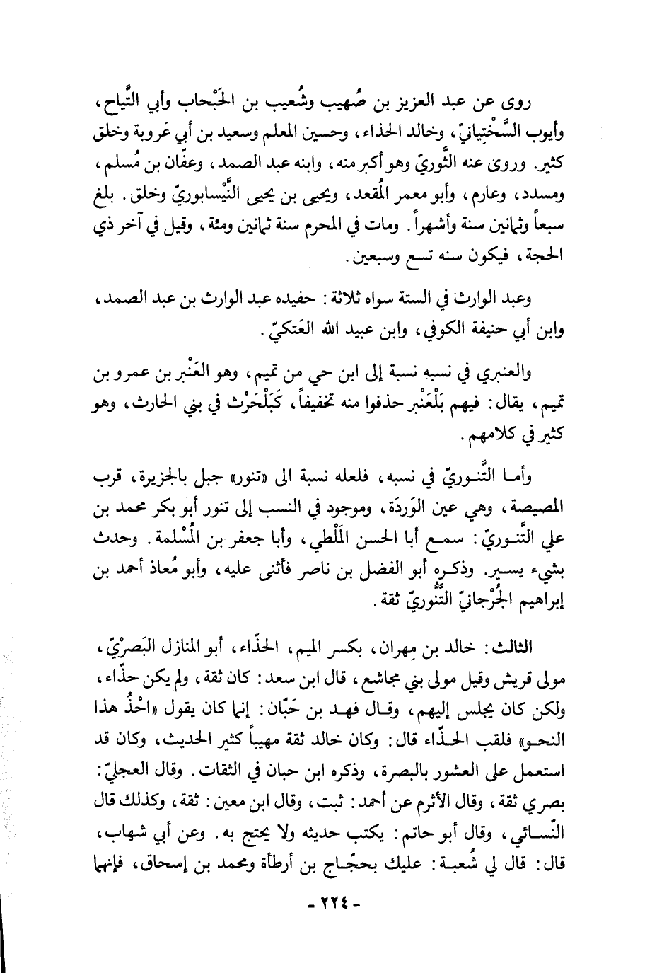 الثالث: خالد بن مِهران، بكسر الميم، الحذّاء، أبو المنازل البَصرْيّ، مولى قريش وقيل مولى بني مجاشع، قال ابن سعد: كان ثقة، ولم يكن حذّاء، ولكن كان يجلس إليهم، وقال فهد بن حَبّان: إنما كان يقول "احْذُ هذا النحو" فلقب الحذّاء قال: وكان خالد ثقة مهيبًا كثير الحديث، وكان قد استعمل على العشور بالبصرة، وذكره ابن حبان في الثقات. وقال العجليّ: بصري ثقة، وقال الأثرم عن أحمد: ثبت، وقال ابن معين: ثقة، وكذلك قال النّسائي، وقال أبو حاتم: يكتب حديثه ولا يحتج به. وعن أبي شهاب، قال: قال لي شُعبة: عليك بحجّاج بن أرطأة ومحمد بن إسحاق، فإنهما