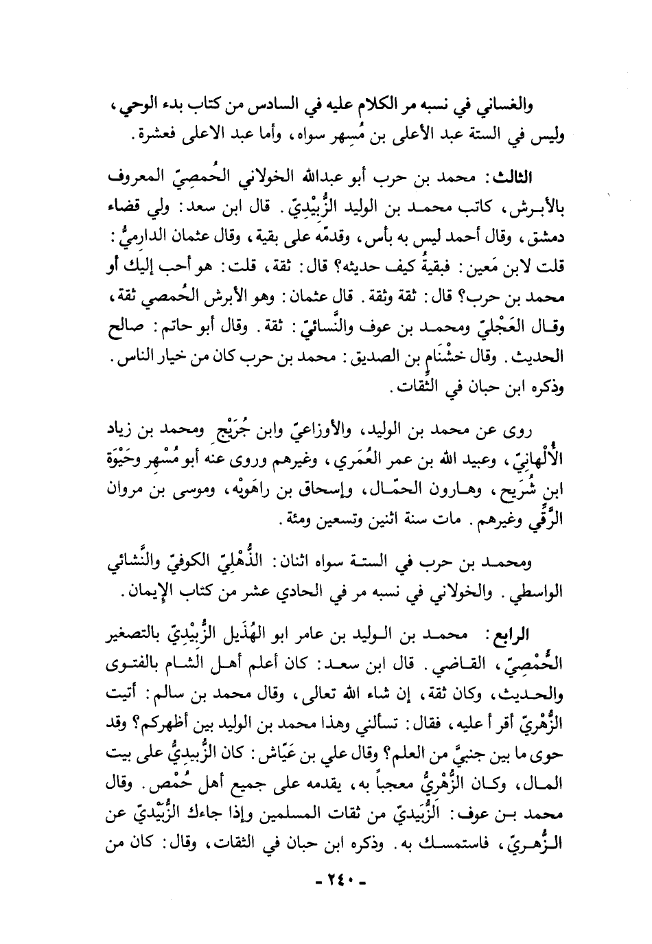 الثالث: محمد بن حرب أبو عبد الله الخولاني الحُمصِيّ المعروف بالأبرش، كاتب محمد بن الوليد الزُّبِيْدِيّ. قال ابن سعد: ولي قضاء دمشق، وقال أحمد ليس به بأس، وقدمّه على بقية، وقال عثمان الدارميُّ: قلت لابن مَعين: فبقيةُ كيف حديثه؟ قال: ثقة، قلت: هو أحب إليك أو محمد بن حرب؟ قال: ثقة وثقة. قال عثمان: وهو الأبرش الحُمصي ثقة، وقال العَجْليّ ومحمد بن عوف والنَّسائيّ: ثقة. وقال أبو حاتم: صالح الحديث. وقال خشْنَام بن الصديق: محمد بن حرب كان من خيار الناس. وذكره ابن حبان في الثِّقات.