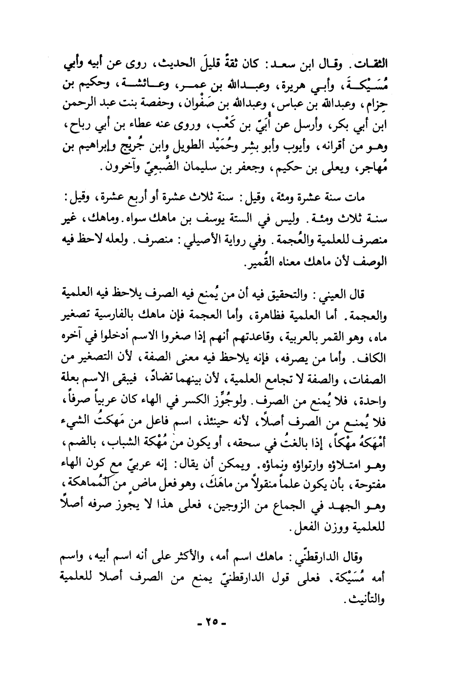 وقال الدارقطنّي: ماهك اسم أمه، والأكثر على أنه اسم أبيه، واسم أمه مُسَيْكة، فعلى قول الدارقطنيّ يمنع من الصرف أصلًا للعلمية والتأنيث.