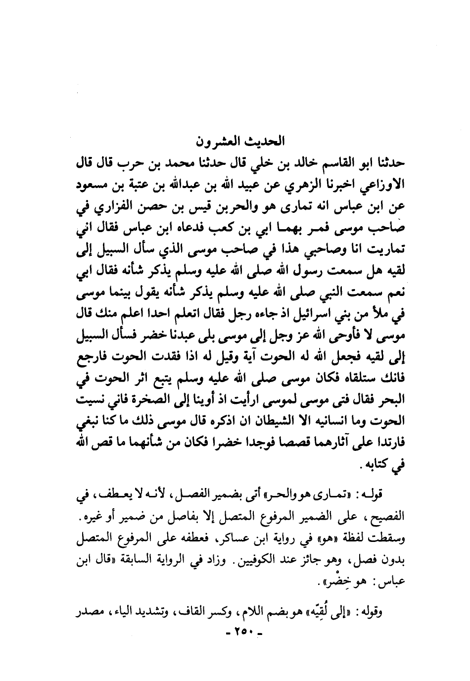 حَدَّثَنَا أَبُو الْقَاسِمِ خَالِدُ بْنُ خَلِيٍّ قَالَ حَدَّثَنَا مُحَمَّدُ بْنُ حَرْبٍ قَالَ: قَالَ الأَوْزَاعِيُّ أَخْبَرَنَا الزُّهْرِيُّ عَنْ عُبَيْدِ اللَّهِ بْنِ عَبْدِ اللَّهِ بْنِ عُتْبَةَ بْنِ مَسْعُودٍ عَنِ ابْنِ عَبَّاسٍ أَنَّهُ تَمَارَى هُوَ وَالْحُرُّ بْنُ قَيْسِ بْنِ حِصْنٍ الْفَزَارِيُّ فِى صَاحِبِ مُوسَى، فَمَرَّ بِهِمَا أُبَيُّ بْنُ كَعْبٍ، فَدَعَاهُ ابْنُ عَبَّاسٍ فَقَالَ إِنِّي تَمَارَيْتُ أَنَا وَصَاحِبِى هَذَا فِى صَاحِبِ مُوسَى الَّذِي سَأَلَ السَّبِيلَ إِلَى لُقِيِّهِ، هَلْ سَمِعْتَ رَسُولَ اللَّهِ -صلى الله عليه وسلم- يَذْكُرُ شَأْنَهُ فَقَالَ أُبَيٌّ نَعَمْ، سَمِعْتُ النَّبِيَّ -صلى الله عليه وسلم- يَذْكُرُ شَأْنَهُ يَقُولُ: "بَيْنَمَا مُوسَى فِي مَلإٍ مِنْ بَنِي إِسْرَائِيلَ، إِذْ جَاءَهُ رَجُلٌ فَقَالَ: أَتَعْلَمُ أَحَدًا أَعْلَمَ مِنْكَ قَالَ مُوسَى: لاَ. فَأَوْحَى اللَّهُ عَزَّ وَجَلَّ إِلَى مُوسَى بَلَى، عَبْدُنَا خَضِرٌ، فَسَأَلَ السَّبِيلَ إِلَى لُقِيِّهِ، فَجَعَلَ اللَّهُ لَهُ الْحُوتَ آيَةً، وَقِيلَ لَهُ إِذَا فَقَدْتَ الْحُوتَ فَارْجِعْ، فَإِنَّكَ سَتَلْقَاهُ، فَكَانَ مُوسَى -صلى الله عليه وسلم- يَتَّبِعُ أَثَرَ الْحُوتِ فِى الْبَحْرِ. فَقَالَ فَتَى مُوسَى لِمُوسَى: أَرَأَيْتَ إِذْ أَوَيْنَا إِلَى الصَّخْرَةِ فَإِنِّي نَسِيتُ الْحُوتَ، وَمَا أَنْسَانِيهِ إِلاَّ الشَّيْطَانُ أَنْ أَذْكُرَهُ. قَالَ مُوسَى: ذَلِكَ مَا كُنَّا نَبْغِى. فَارْتَدَّا عَلَى آثَارِهِمَا قَصَصًا، فَوَجَدَا خَضِرًا، فَكَانَ مِنْ شَأْنِهِمَا مَا قَصَّ اللَّهُ فِى كِتَابِهِ".