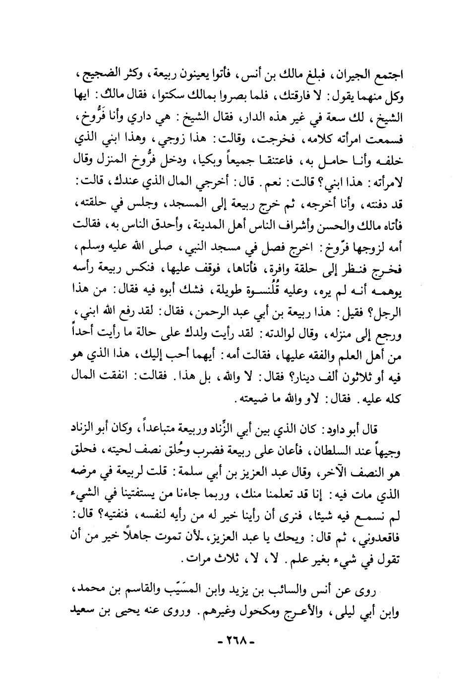 قال أبو داود: كان الذي بين أبي الزَّناد وربيعة متباعدًا، وكان أبو الزناد وجيهًا عند السلطان، فأعان على ربيعة فضرب وحُلق نصف لحيته، فحلق هو النصف الآخر، وقال عبد العزيز بن أبي سلمة: قلت لربيعة في مرضه الذي مات فيه: إنا قد تعلمنا منك، وربما جاءنا من يستفتينا في الشيء لم نسمع فيه شيئًا، فنرى أن رأينا خير له من رأيه لنفسه، فنفتيه؟ قال: فاقعدوني، ثم قال: ويحك يا عبد العزيز؛ لأن تموت جاهلًا خير من أن تقول في شيء بغير علم. لا، لا، ثلاث مرات.