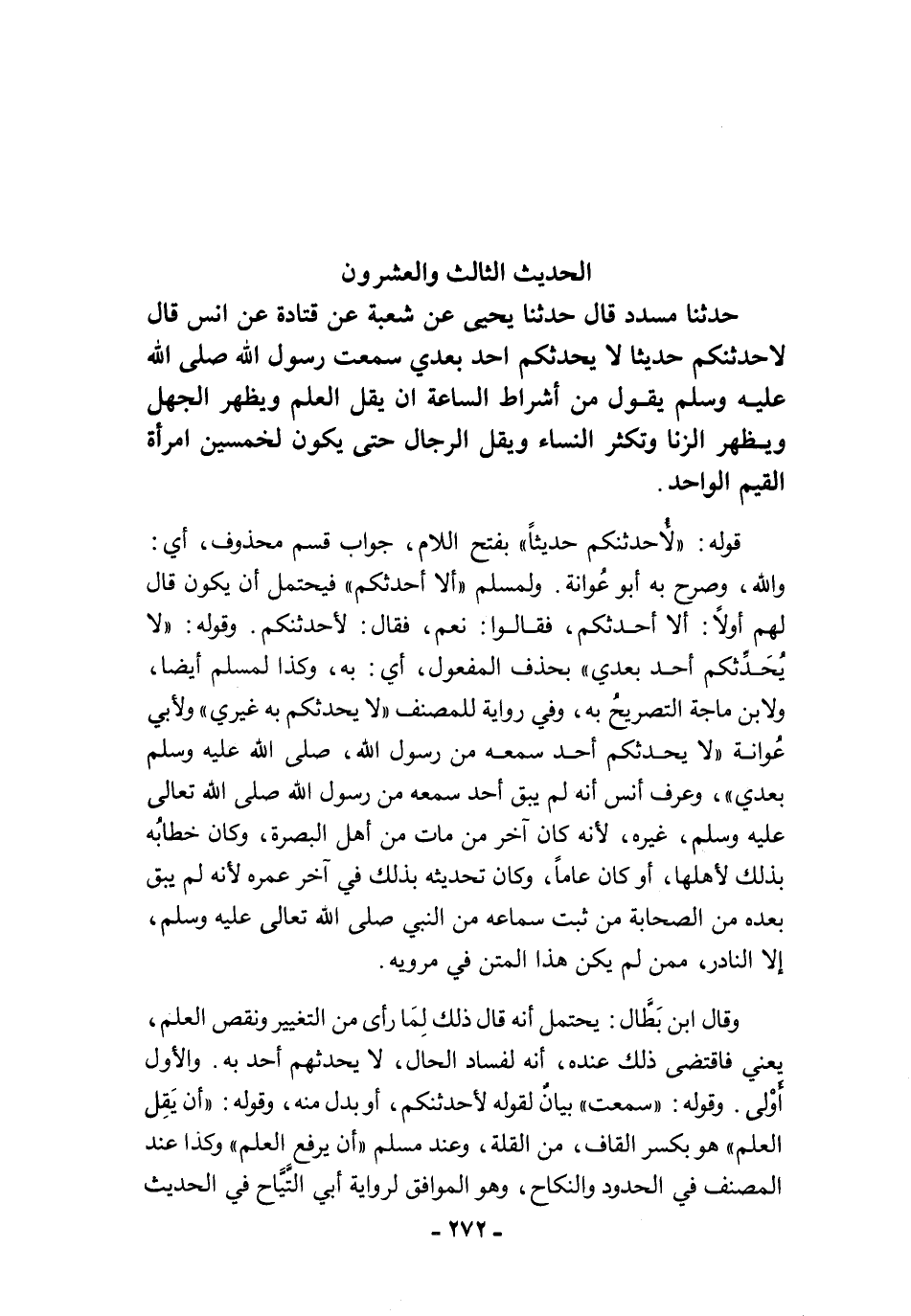 حَدَّثَنَا مُسَدَّدٌ قَالَ: حَدَّثَنَا يَحْيَى عَنْ شُعْبَةَ عَنْ قَتَادَةَ عَنْ أَنَسٍ قَالَ: لأُحَدِّثَنَّكُمْ حَدِيثًا لاَ يُحَدِّثُكُمْ أَحَدٌ بَعْدِي سَمِعْتُ رَسُولَ اللَّهِ -صلى الله عليه وسلم- يَقُولُ: "مِنْ أَشْرَاطِ السَّاعَةِ أَنْ يَقِلَّ الْعِلْمُ، وَيَظْهَرَ الْجَهْلُ، وَيَظْهَرَ الزِّنَا، وَتَكْثُرَ النِّسَاءُ وَيَقِلَّ الرِّجَالُ، حَتَّى يَكُونَ لِخَمْسِينَ امْرَأَةً الْقَيِّمُ الْوَاحِدُ".