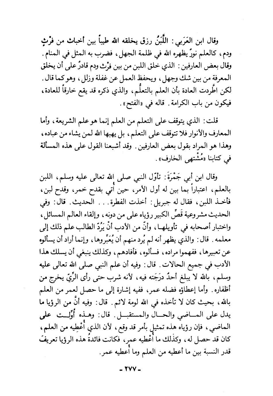 وقال ابن العَرَبي: اللَّبَنُ رزق يخلقه الله طيبًا بين أخباث من فرْثٍ ودم، كالعلم نورٌ يظهره الله في ظلمة الجهل، فضرب به المثل في المنام. وقال بعض العارفين: الذي خلق اللبن من بين فرْث ودم قادرٌ على أن يخلق المعرفة من بين شك وجهل، ويحفظ العمل عن غفلة وزلل، وهو كما قال. لكن اطَّردت العادة بأن العلم بالتعلُّم، والذي ذكره قد يقع خارقًا للعادة، فيكون من باب الكرامة. قاله في "الفتح".