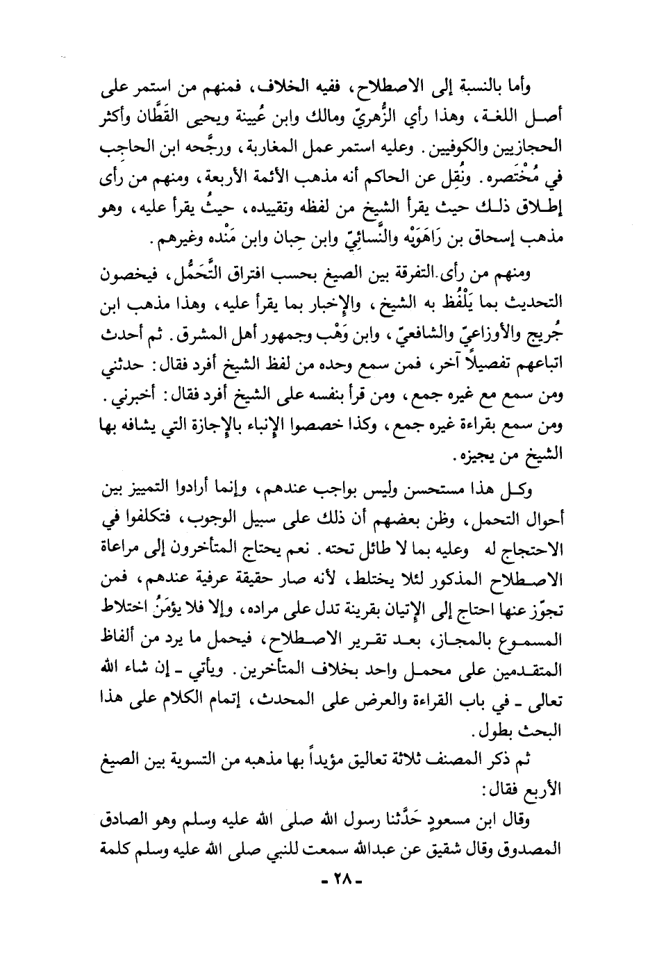 وكل هذا مستحسن وليس بواجب عندهم، وإنما أرادوا التمييز بين أحوال التحمل، وظن بعضهم أن ذلك على سبيل الوجوب، فتكلفوا في الاحتجاج له وعليه بما لا طائل تحته. نعم يحتاج المتأخرون إلى مراعاة الاصطلاح المذكور لئلا يختلط، لأنه صار حقيقة عرفية عندهم، فمن تجوّز عنها احتاج إلى الإِتيان بقرينة تدل على مراده، وإلا فلا يؤمَنُ اختلاط المسموع بالمجاز، بعد تقرير الاصطلاح، فيحمل ما يرد من ألفاظ المتقدمين على محمل واحد بخلاف المتأخرين. ويأتي -إن شاء الله تعالى- في باب القراءة والعرض على المحدث، إتمام الكلام على هذا البحث بطول.