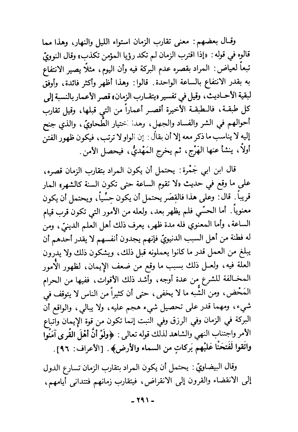 وقال البيضاويّ: يحتمل أن يكون المراد بتقارب الزمان تسارع الدول إلى الانقضاء والقرون إلى الانقراض، فيتقارب زمانهم فتتدانى أيامهم،